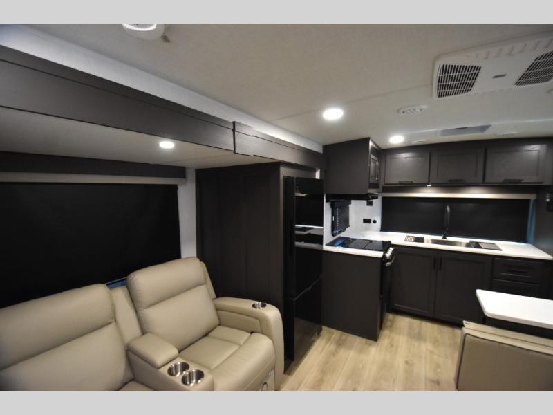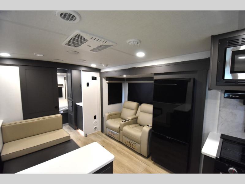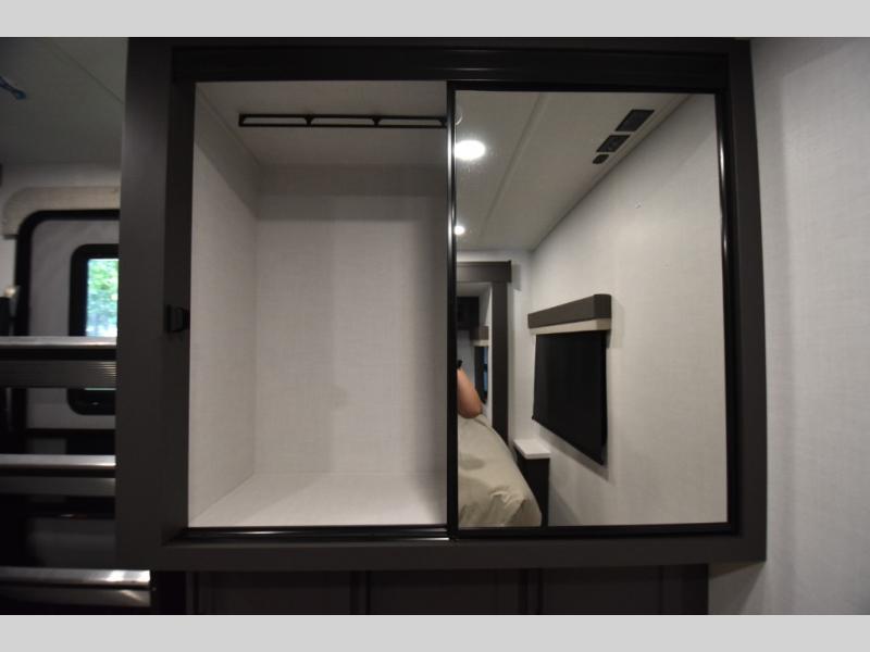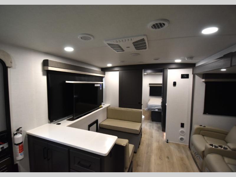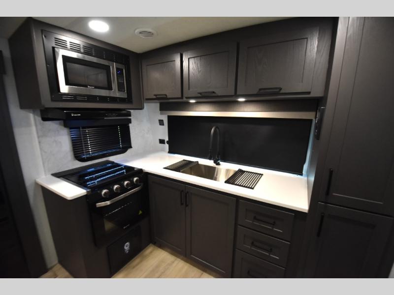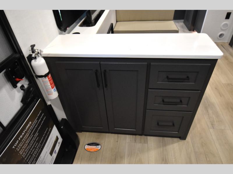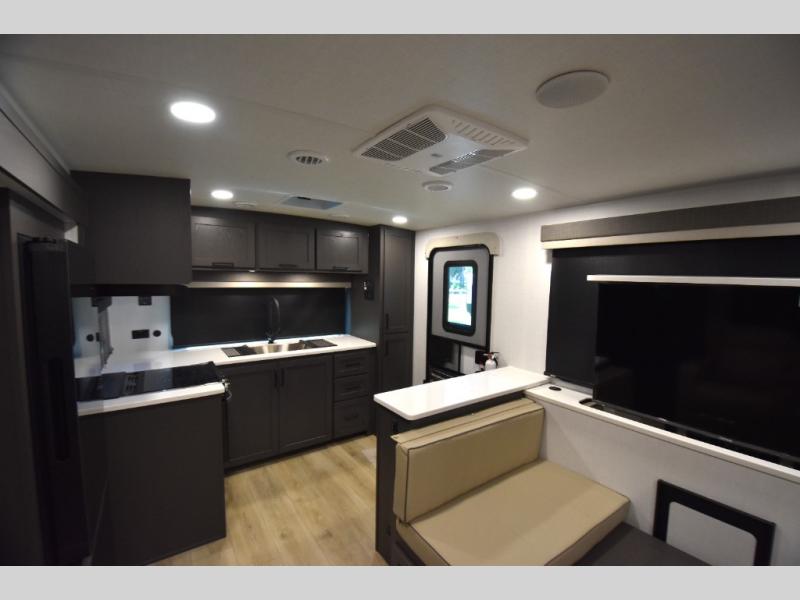 Wherever you decide to camp, you can be sure to enjoy your time in this double slide out trailer! The chef of your group will love having a front kitchen with generous counter space plus an exterior griddle when the weather is nice. There is also a 21' awning outdoors, along with Solid Entry Steps, and dual entry doors! A 39" booth dinette provides a place to dine or play a card game after dinner, and the theater seat across from the 40" TV is perfect for movie night. The walk-thru bath leads to the rear master bedroom where you'll find a queen bed, a large wardrobe, and a TV option if you enjoy shows in bed!