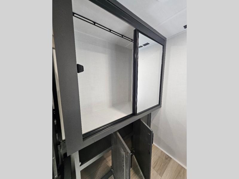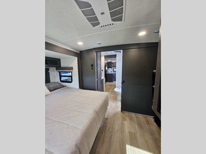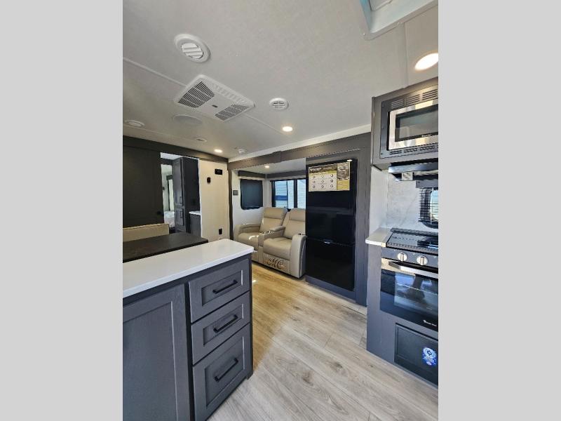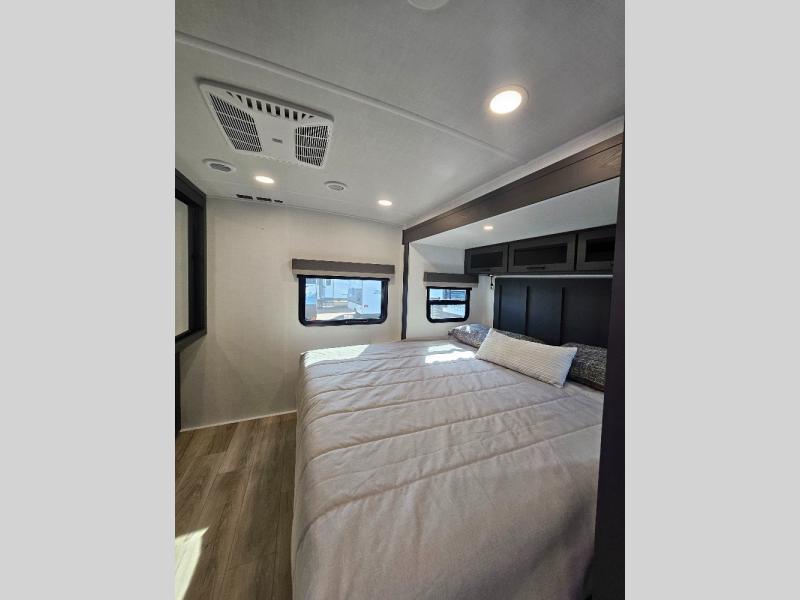 Wherever you decide to camp, you can be sure to enjoy your time in this double slide out trailer! The chef of your group will love having a front kitchen with generous counter space plus ample over-head cabinet space. There is also a 21' awning outdoors, along with Solid Entry Steps, and dual entry doors! A 39" booth dinette provides a place to dine or play a card game after dinner, and the theater seat across from the TV is perfect for movie night. The walk-thru bath leads to the rear master bedroom where you'll find a queen bed, a large wardrobe, and the second entrance to the trailer for easy access to both the wardrobe and the bathroom nearby!