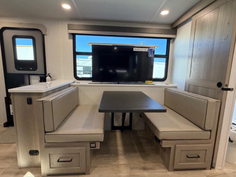 Wherever you decide to camp, you can be sure to enjoy your time in this double slide out trailer! The chef of your group will love having a front kitchen with generous counter space plus ample over-head cabinet space. There is also a 21' awning outdoors, along with Solid Entry Steps, and dual entry doors! A 39" booth dinette provides a place to dine or play a card game after dinner, and the theater seat across from the TV is perfect for movie night. The walk-thru bath leads to the rear master bedroom where you'll find a queen bed, a large wardrobe, and the second entrance to the trailer for easy access to both the wardrobe and the bathroom nearby!