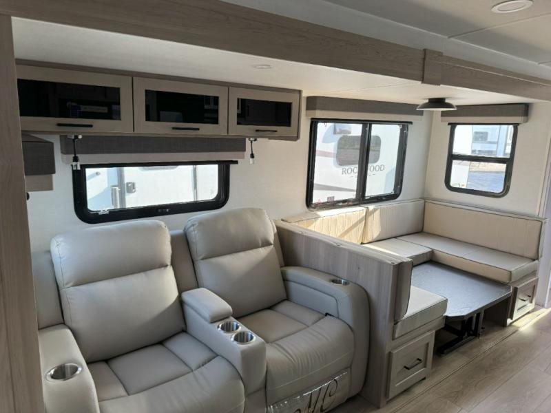 Each Rockwood Ultra Lite travel trailer by Forest River includes superior construction with a high gloss front cap, laminated white fiberglass sidewalls, and tinted frameless windows for a sleek look. The torsion axle, Rubber-Ryde suspension will make towing smooth and hassle-free, along with the nitrogen filled, Goodyear Endurance tires and the tire pressure monitor system. Interior comforts include designer kitchen backsplash, solid wood cabinet doors with hidden hinges, and night roller shades to name a few. Choose a Rockwood Ultra Lite travel trailer today!