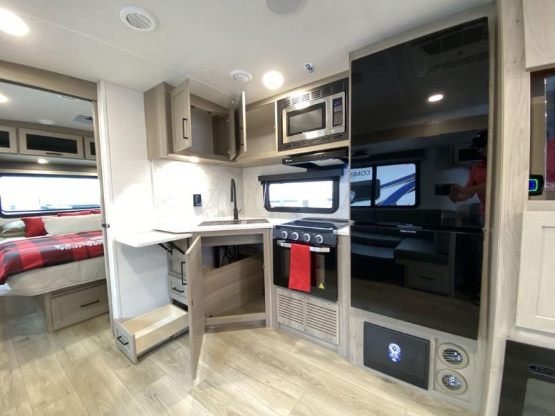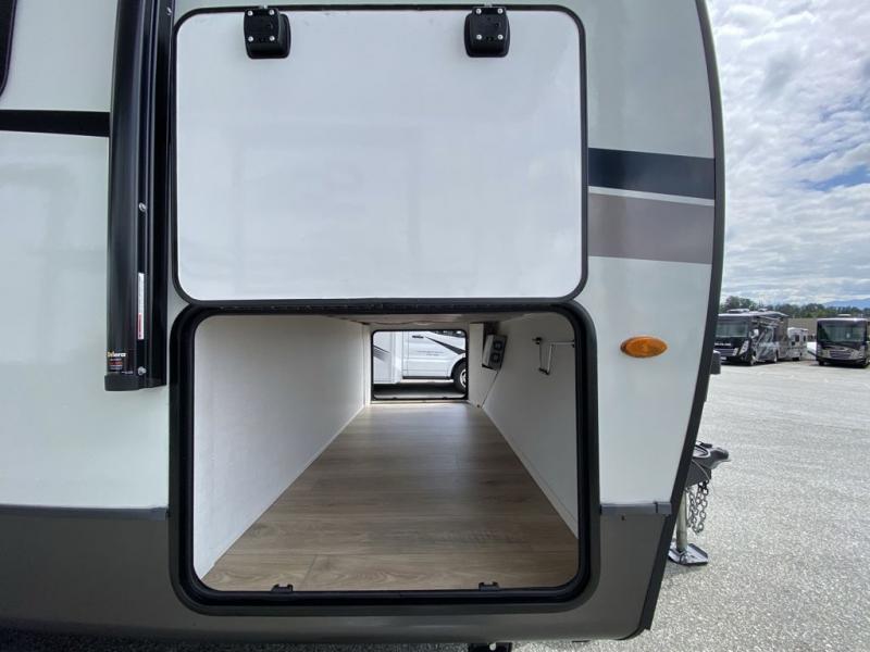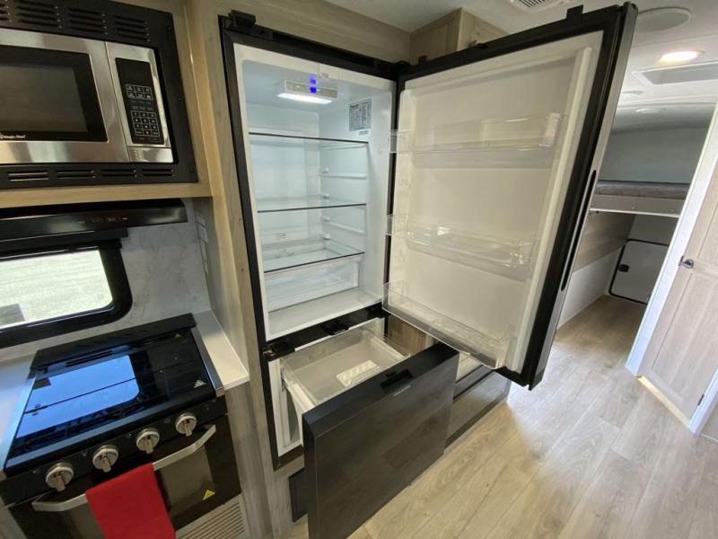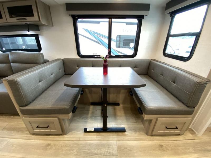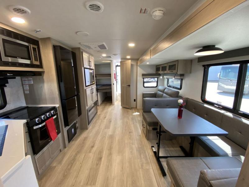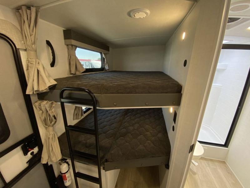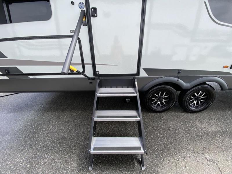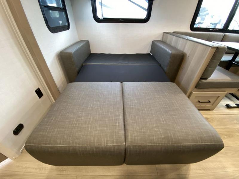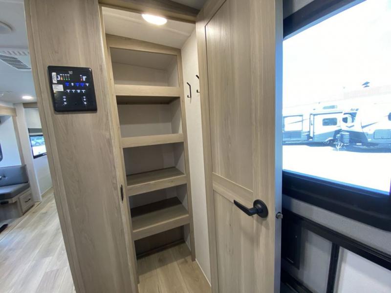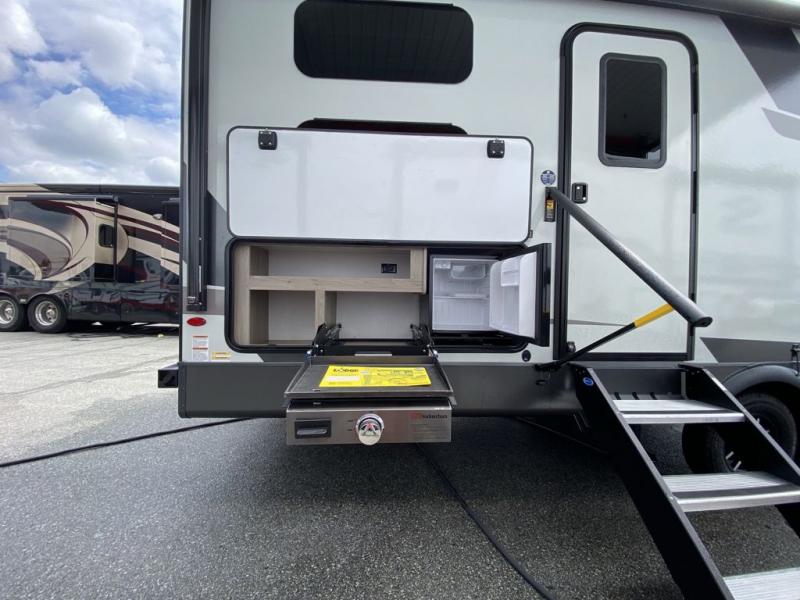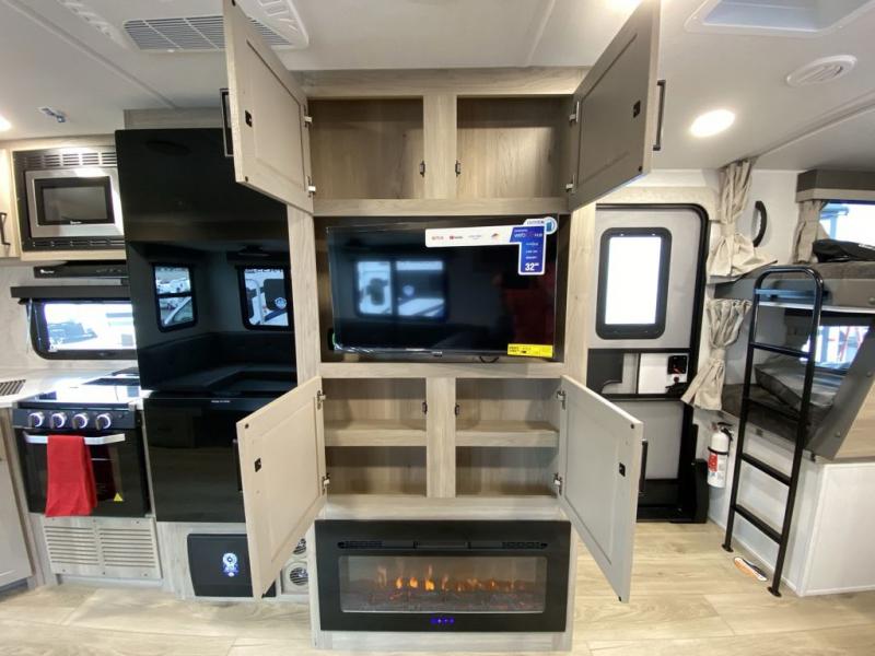 Looking for a trailer that sleeps eight, allows you to cook indoors or outdoors, and provides added interior space? This trailer provides for those wants and needs, and even more! The outside kitchen gives you more choices when feeding the masses along with the outside griddle, and the interior kitchen includes an L-shaped area for the cook to have their own space with full amenities including a walk-in pantry to bring along everything they need. The full bathroom will keep everyone refreshed, and the theater seating and U-shaped dinette offer seating inside to enjoy the Smart TV and fireplace. There is plenty of storage found throughout the interior, and along the exterior you will find several places to stow your outdoor items including in the pass thru storage with an optional steel sliding tray. There is even a front door option if you prefer to have dual entry doors!