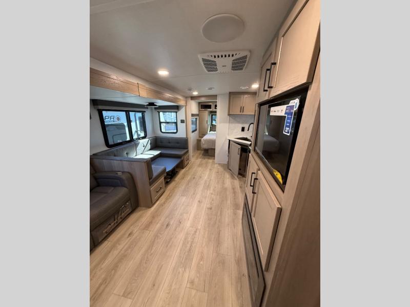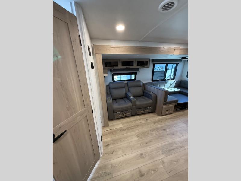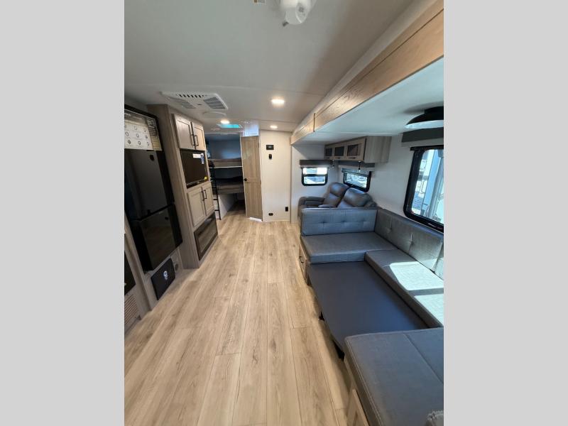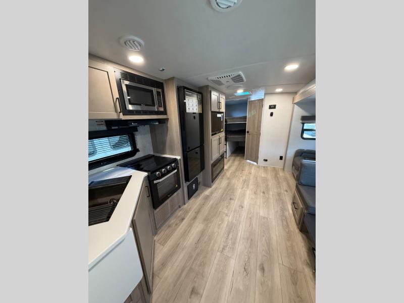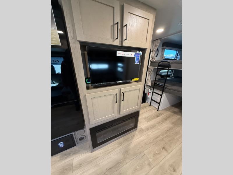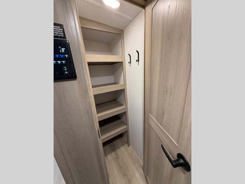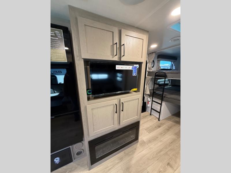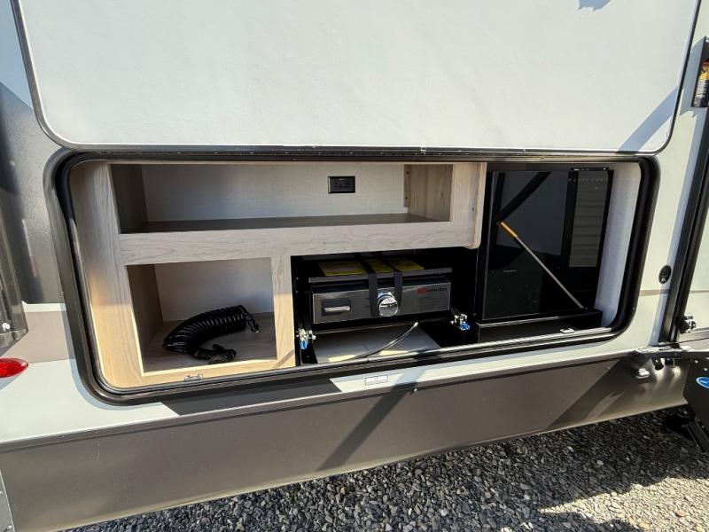 Looking for a trailer that sleeps eight, allows you to cook indoors or outdoors, and provides added interior space? This trailer provides for those wants and needs, and even more! The outside kitchen gives you more choices when feeding the masses along with the outside griddle, and the interior kitchen includes an L-shaped area for the cook to have their own space with full amenities including a walk-in pantry to bring along everything they need. The full bathroom will keep everyone refreshed, and the theater seating and U-shaped dinette offer seating inside to enjoy the Smart TV and fireplace. There is plenty of storage found throughout the interior, and along the exterior you will find several places to stow your outdoor items including in the pass thru storage with an optional steel sliding tray. There is even a front door option if you prefer to have dual entry doors!
