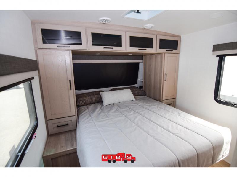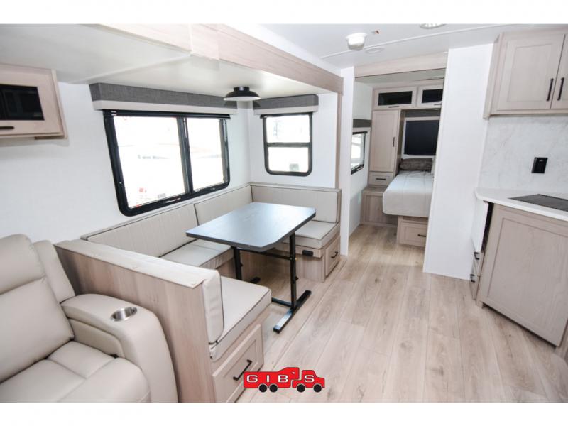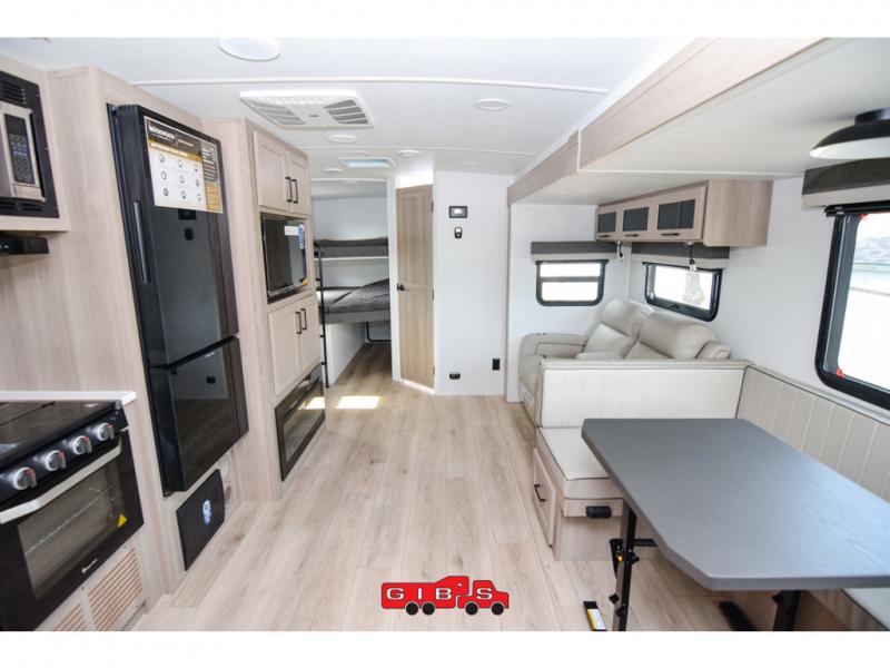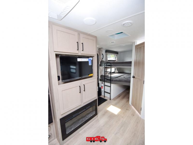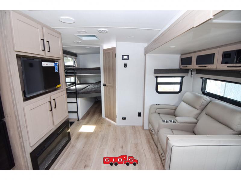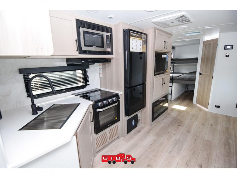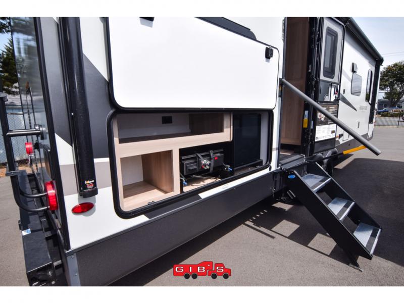 Looking for a trailer that sleeps eight, allows you to cook indoors or outdoors, and provides added interior space? This trailer provides for those wants and needs, and even more! The outside kitchen gives you more choices when feeding the masses along with the outside griddle, and the interior kitchen includes an L-shaped area for the cook to have their own space with full amenities including a walk-in pantry to bring along everything they need. The full bathroom will keep everyone refreshed, and the theater seating and U-shaped dinette offer seating inside to enjoy the Smart TV and fireplace. There is plenty of storage found throughout the interior, and along the exterior you will find several places to stow your outdoor items including in the pass thru storage with an optional steel sliding tray. There is even a front door option if you prefer to have dual entry doors!