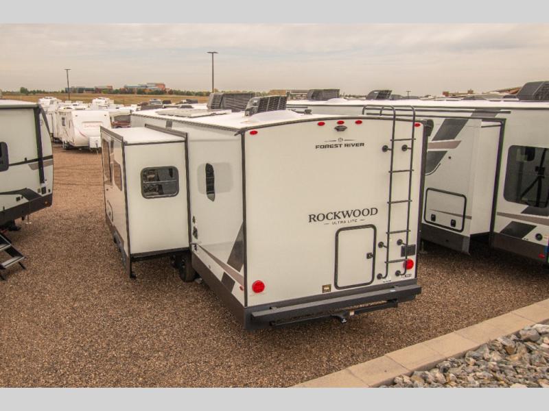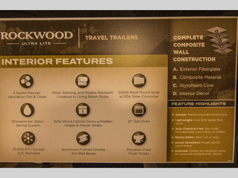 Each Rockwood Ultra Lite travel trailer by Forest River includes superior construction with a high gloss fiberglass cap, aluminum cage construction, and a power awning with LED lighting for a cozy and functional outdoor space. The torsion axle, power tongue jack will make towing smooth and hassle-free, along with the nitrogen filled, Goodyear Endurance tires and the tire pressure monitor system. Interior comforts include kitchen sink with high rise faucet, hidden hinge cabinet doors, and roller shades to name a few. Choose a Rockwood Ultra Lite travel trailer today!