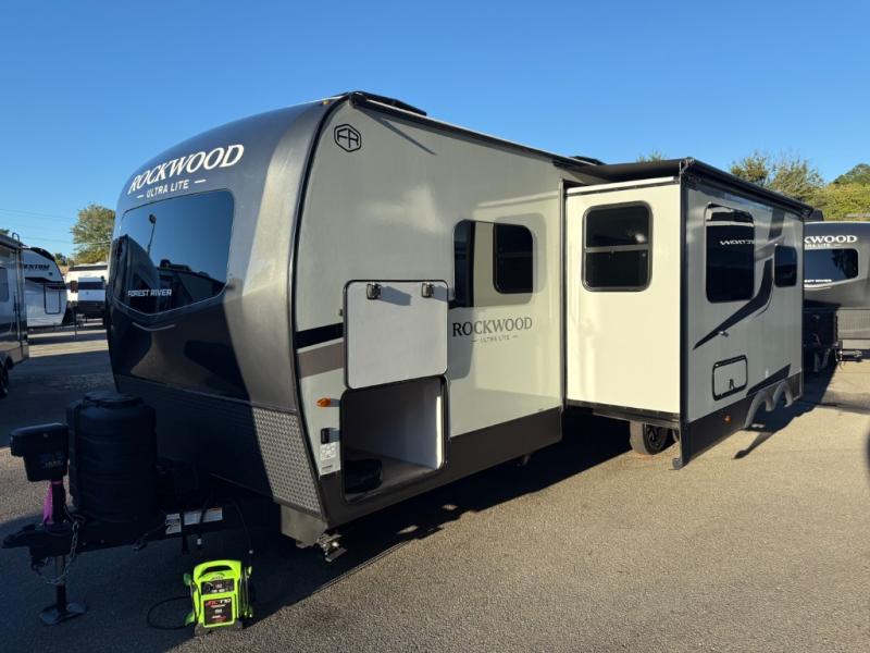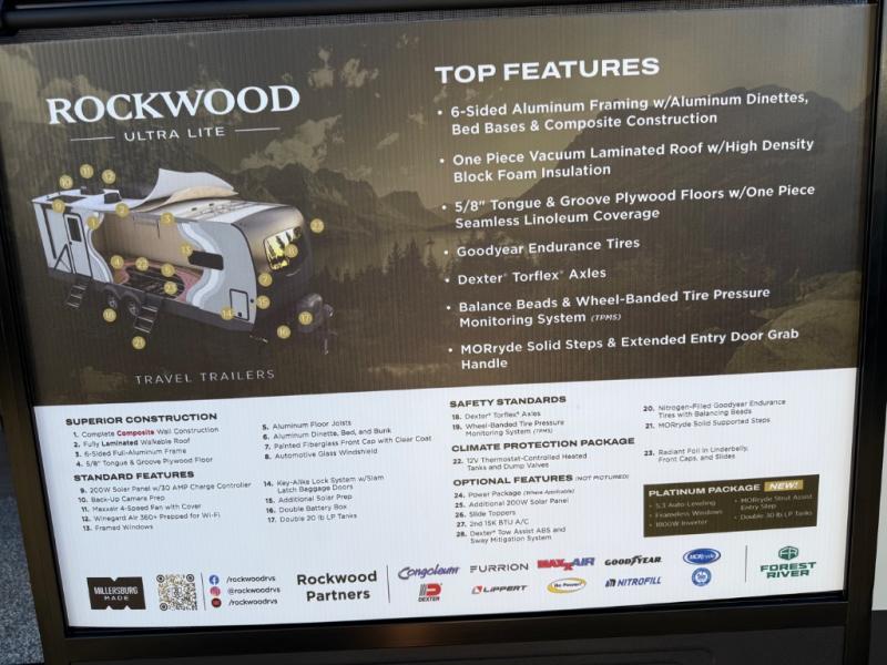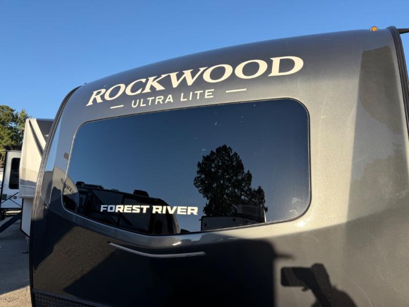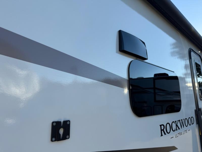 Each Rockwood Ultra Lite travel trailer by Forest River includes superior construction with a high gloss fiberglass cap, aluminum cage construction, and a power awning with LED lighting for a cozy and functional outdoor space. The torsion axle, power tongue jack will make towing smooth and hassle-free, along with the nitrogen filled, Goodyear Endurance tires and the tire pressure monitor system. Interior comforts include kitchen sink with high rise faucet, hidden hinge cabinet doors, and roller shades to name a few. Choose a Rockwood Ultra Lite travel trailer today!