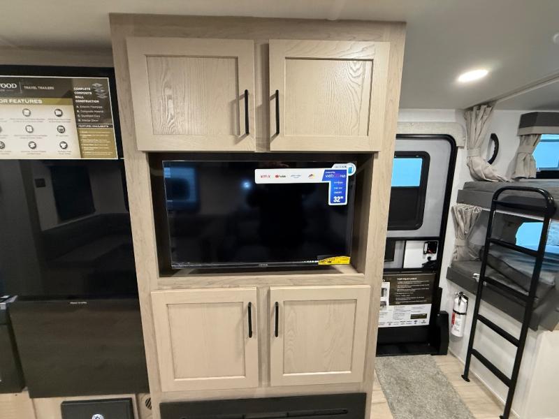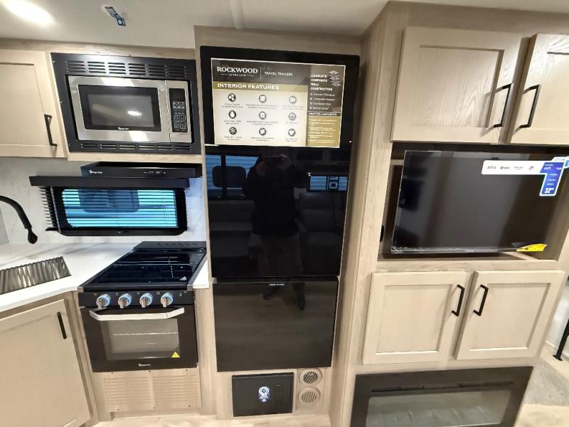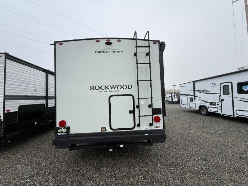 Each Rockwood Ultra Lite travel trailer by Forest River includes superior construction with a high gloss fiberglass cap, aluminum cage construction, and a power awning with LED lighting for a cozy and functional outdoor space. The torsion axle, power tongue jack will make towing smooth and hassle-free, along with the nitrogen filled, Goodyear Endurance tires and the tire pressure monitor system. Interior comforts include kitchen sink with high rise faucet, hidden hinge cabinet doors, and roller shades to name a few. Choose a Rockwood Ultra Lite travel trailer today!