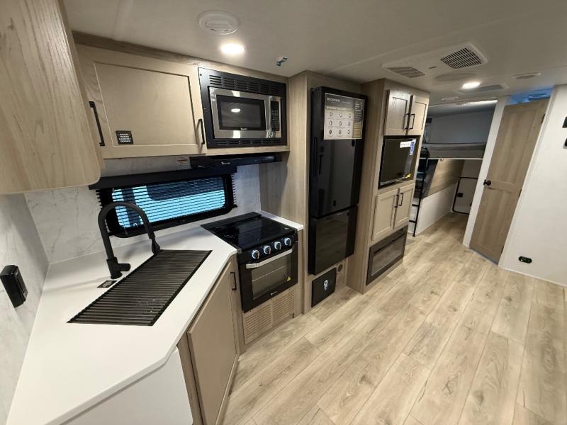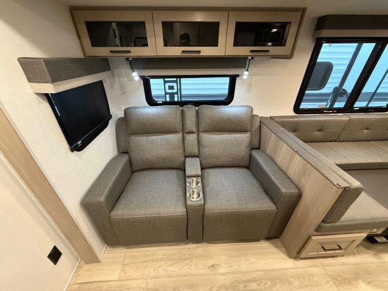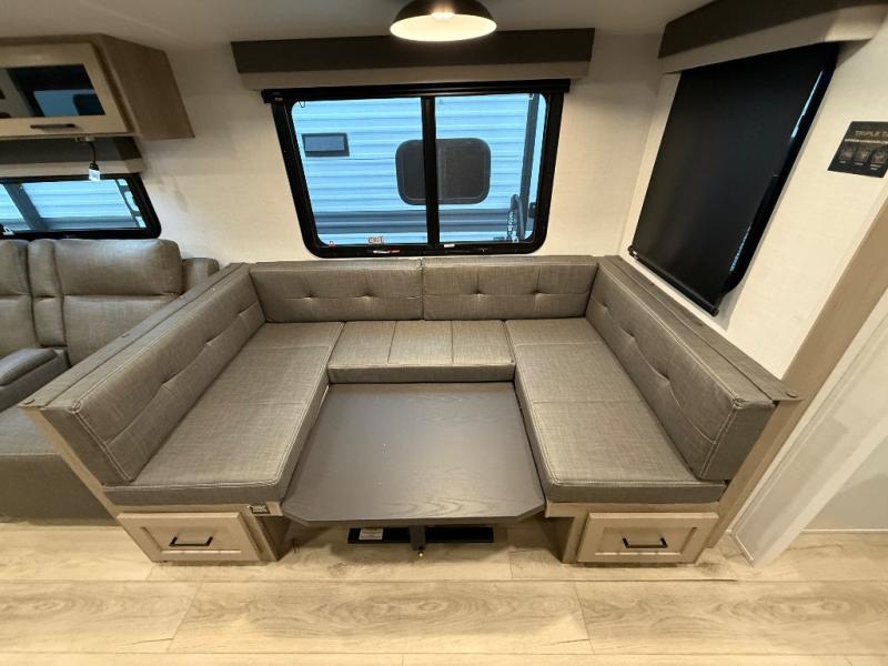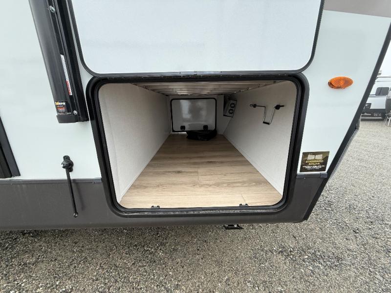 Looking for a trailer that sleeps eight, allows you to cook indoors or outdoors, and provides added interior space? This trailer provides for those wants and needs, and even more! The outside kitchen gives you more choices when feeding the masses along with the outside griddle, and the interior kitchen includes an L-shaped area for the cook to have their own space with full amenities including a walk-in pantry to bring along everything they need. The full bathroom will keep everyone refreshed, and the theater seating and U-shaped dinette offer seating inside to enjoy the Smart TV and fireplace. There is plenty of storage found throughout the interior, and along the exterior you will find several places to stow your outdoor items including in the pass thru storage with an optional steel sliding tray. There is even a front door option if you prefer to have dual entry doors!