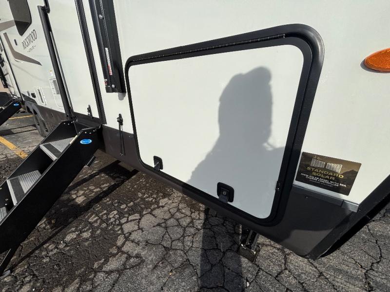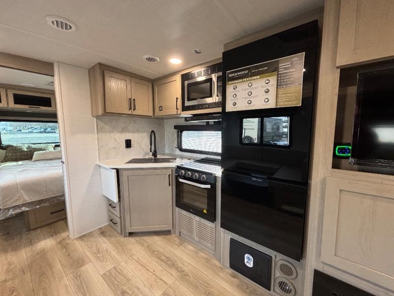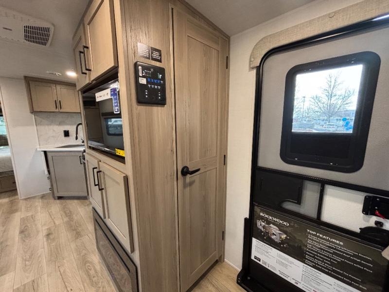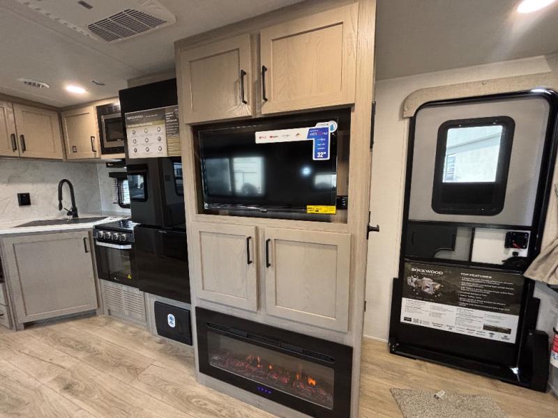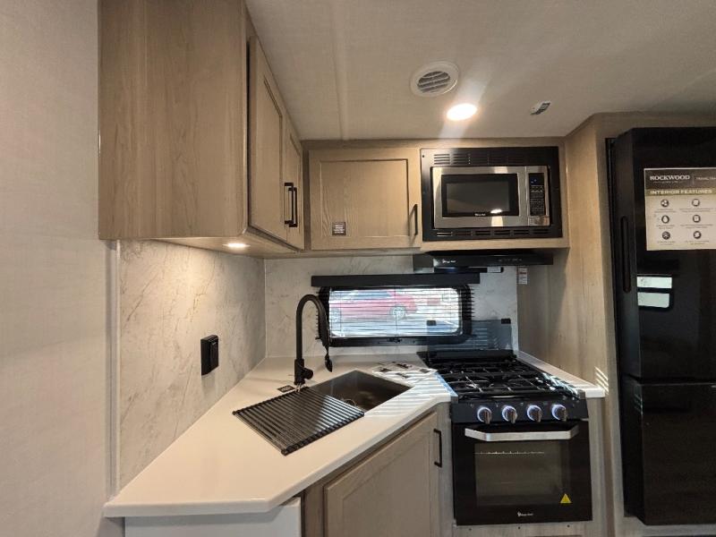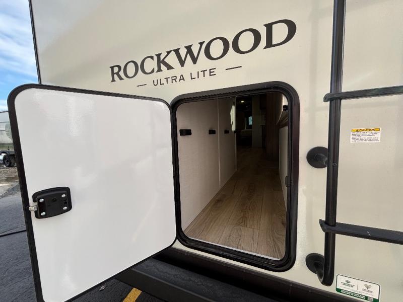 Each Rockwood Ultra Lite travel trailer by Forest River includes superior construction with a high gloss fiberglass cap, aluminum cage construction, and a power awning with LED lighting for a cozy and functional outdoor space. The torsion axle, power tongue jack will make towing smooth and hassle-free, along with the nitrogen filled, Goodyear Endurance tires and the tire pressure monitor system. Interior comforts include kitchen sink with high rise faucet, hidden hinge cabinet doors, and roller shades to name a few. Choose a Rockwood Ultra Lite travel trailer today!