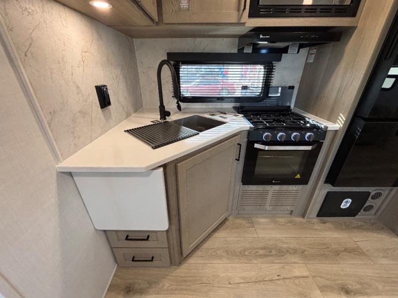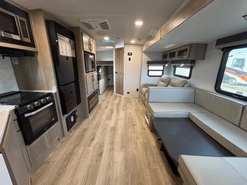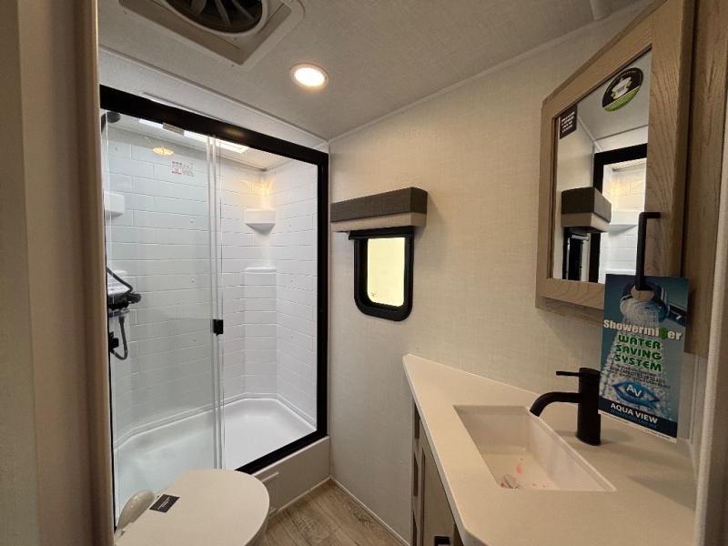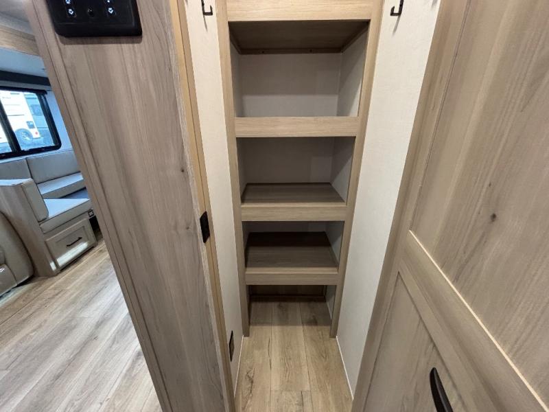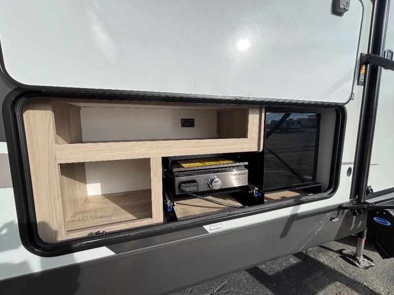 Looking for a trailer that sleeps eight, allows you to cook indoors or outdoors, and provides added interior space? This trailer provides for those wants and needs, and even more! The outside kitchen gives you more choices when feeding the masses along with the outside griddle, and the interior kitchen includes an L-shaped area for the cook to have their own space with full amenities including a walk-in pantry to bring along everything they need. The full bathroom will keep everyone refreshed, and the theater seating and U-shaped dinette offer seating inside to enjoy the Smart TV and fireplace. There is plenty of storage found throughout the interior, and along the exterior you will find several places to stow your outdoor items including in the pass thru storage with an optional steel sliding tray. There is even a front door option if you prefer to have dual entry doors!
