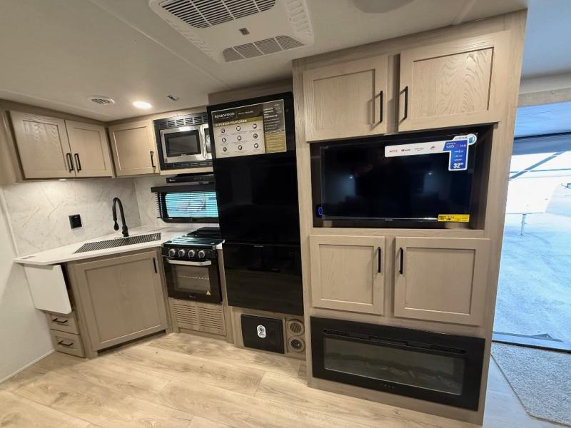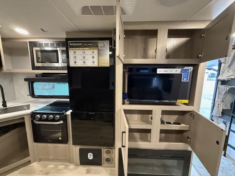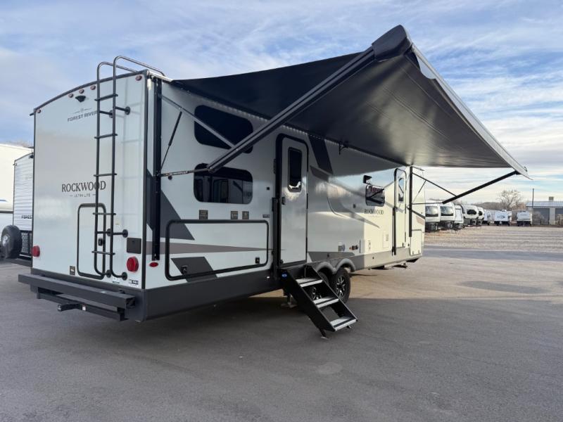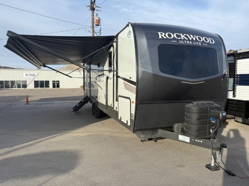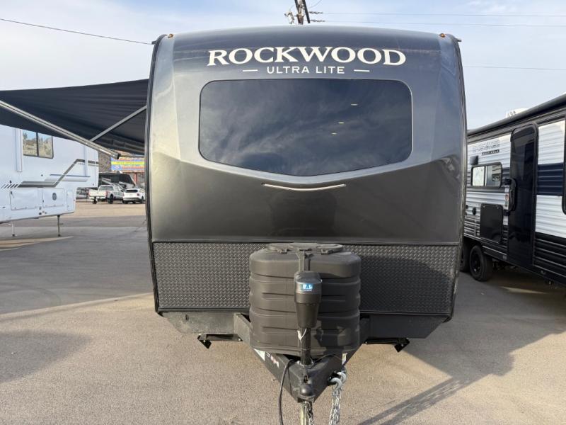 Each Rockwood Ultra Lite travel trailer by Forest River includes superior construction with a high gloss fiberglass cap, aluminum cage construction, and a power awning with LED lighting for a cozy and functional outdoor space. The torsion axle, power tongue jack will make towing smooth and hassle-free, along with the nitrogen filled, Goodyear Endurance tires and the tire pressure monitor system. Interior comforts include kitchen sink with high rise faucet, hidden hinge cabinet doors, and roller shades to name a few. Choose a Rockwood Ultra Lite travel trailer today!