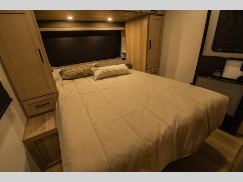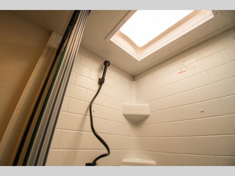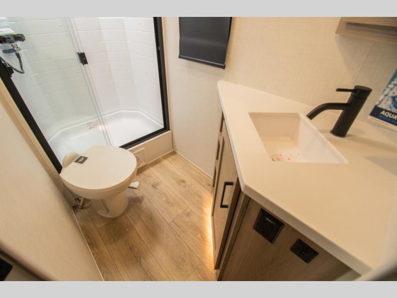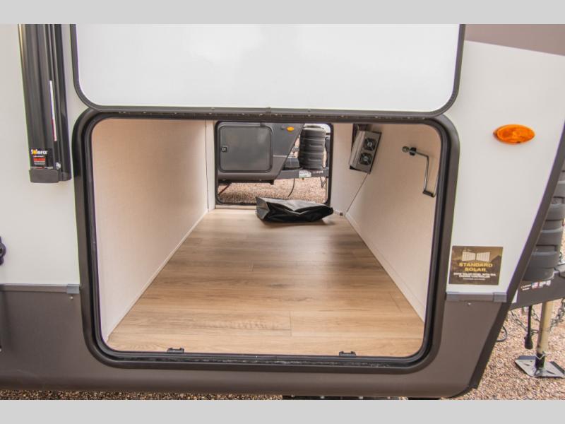 A full bathroom helps keep everyone comfortable on longer stays, and storage is thoughtfully placed throughout the interior. Outside, multiple exterior compartments, including pass-through storage with an optional steel sliding tray, make it easy to organize and access camping gear. A front door option is also available for those who prefer dual entry doors.