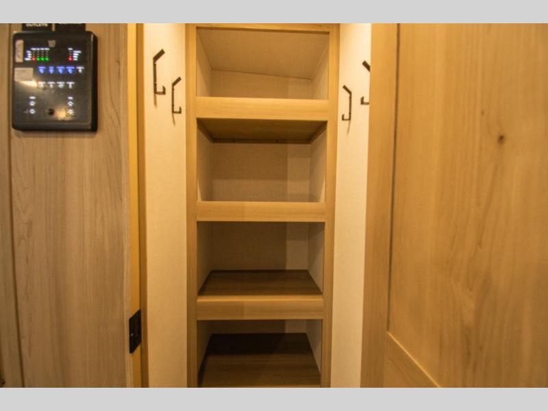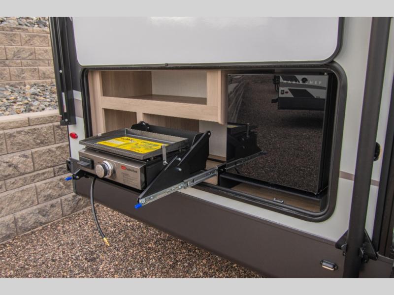 The interior kitchen features an L-shaped layout that gives the cook their own workspace, with full amenities and a walk-in pantry for storing food and supplies for longer trips. When the weather’s right, the outside kitchen and exterior griddle make it easy to prepare meals outdoors without crowding the interior.