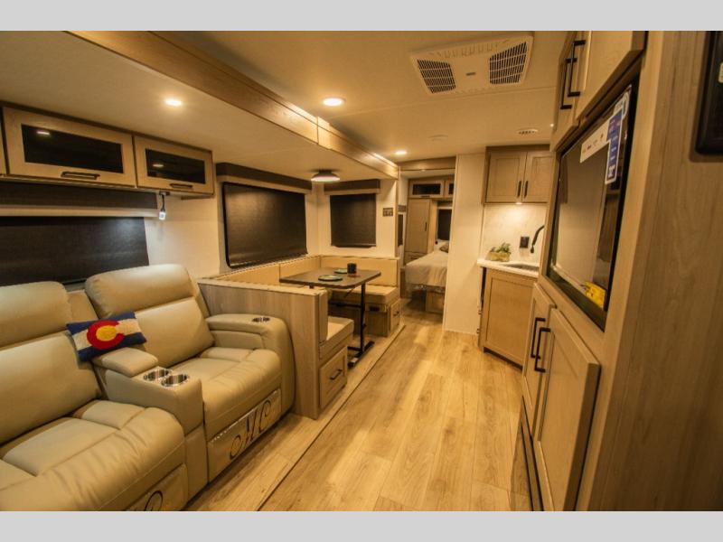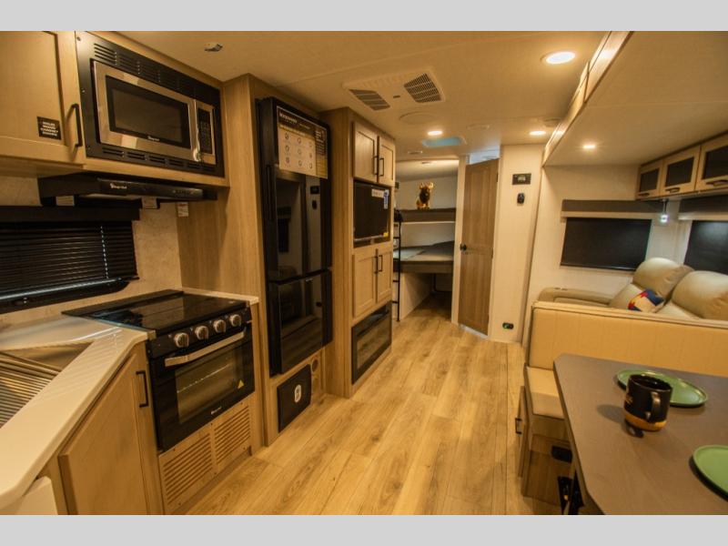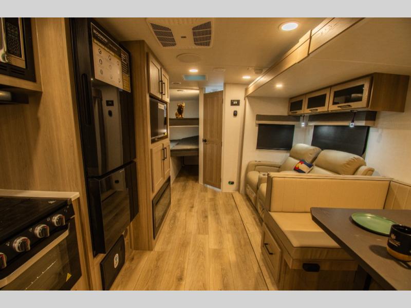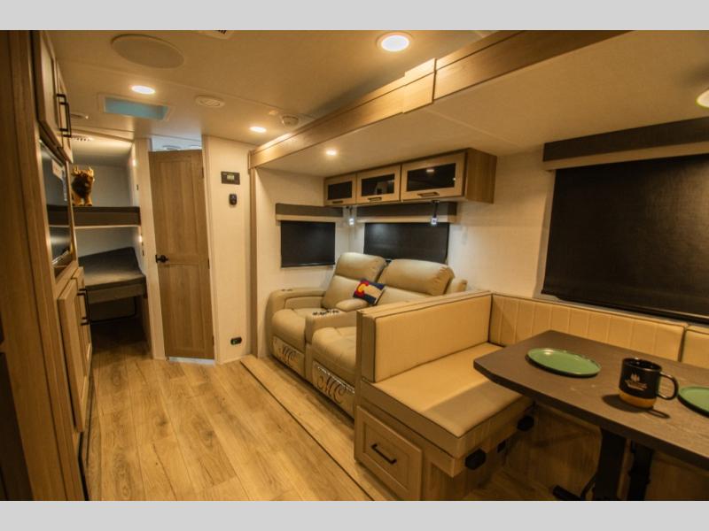 The layout centers around a spacious interior that makes it easy for multiple people to move and gather comfortably. Double-size bunks provide generous sleeping space, while the U-shaped dinette and theater seating offer plenty of room for meals, games, or relaxing inside.