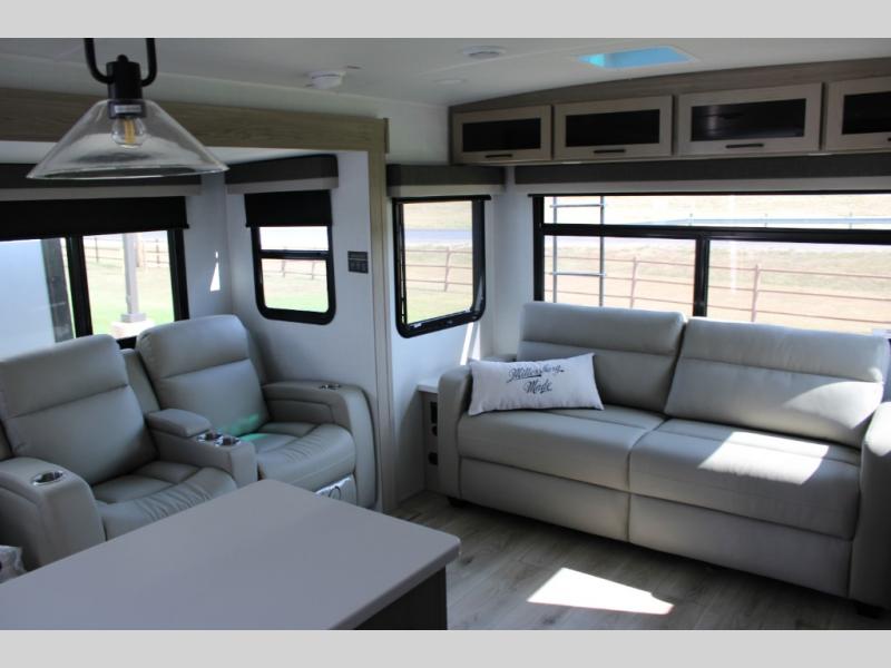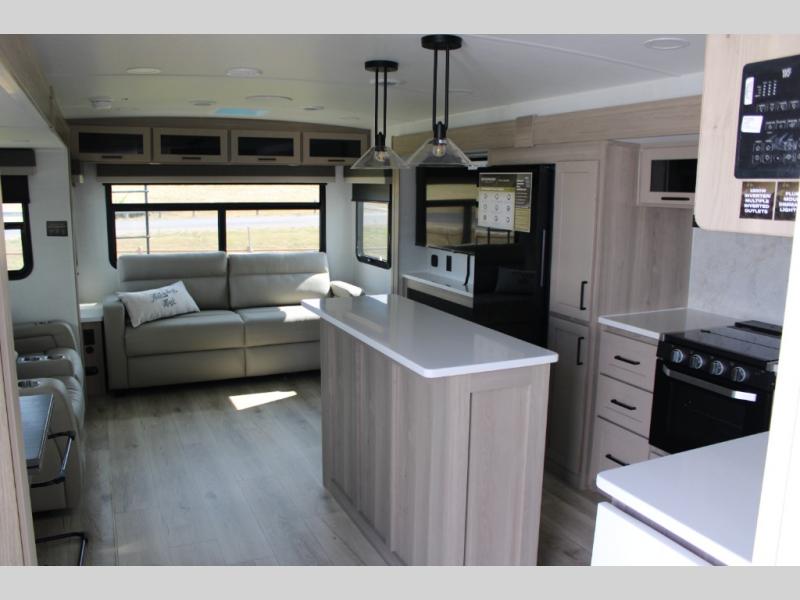Theater Seating, Kitchen Island, Two Wardrobes, Two Awnings, & Dual Opposing Slides!