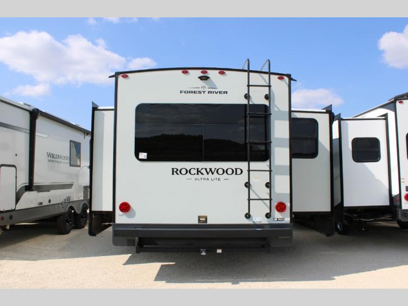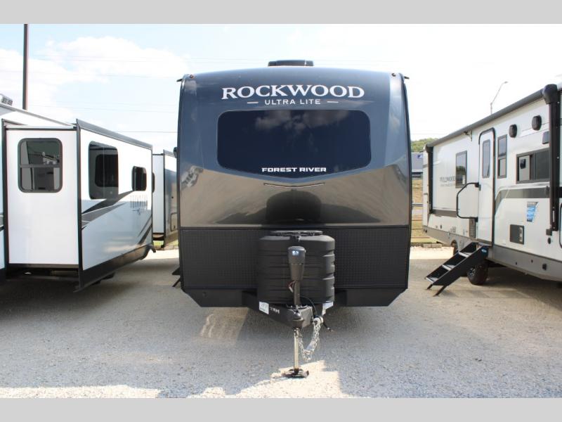 Each Rockwood Ultra Lite travel trailer by Forest River includes superior construction with a high gloss fiberglass cap, aluminum cage construction, and a power awning with LED lighting for a cozy and functional outdoor space. The torsion axle, power tongue jack will make towing smooth and hassle-free, along with the nitrogen filled, Goodyear Endurance tires and the tire pressure monitor system. Interior comforts include kitchen sink with high rise faucet, hidden hinge cabinet doors, and roller shades to name a few. Choose a Rockwood Ultra Lite travel trailer today!