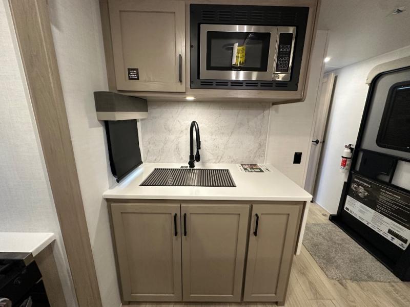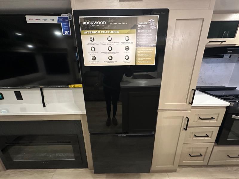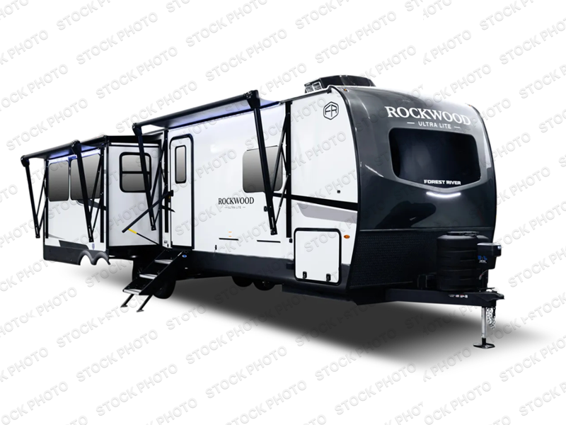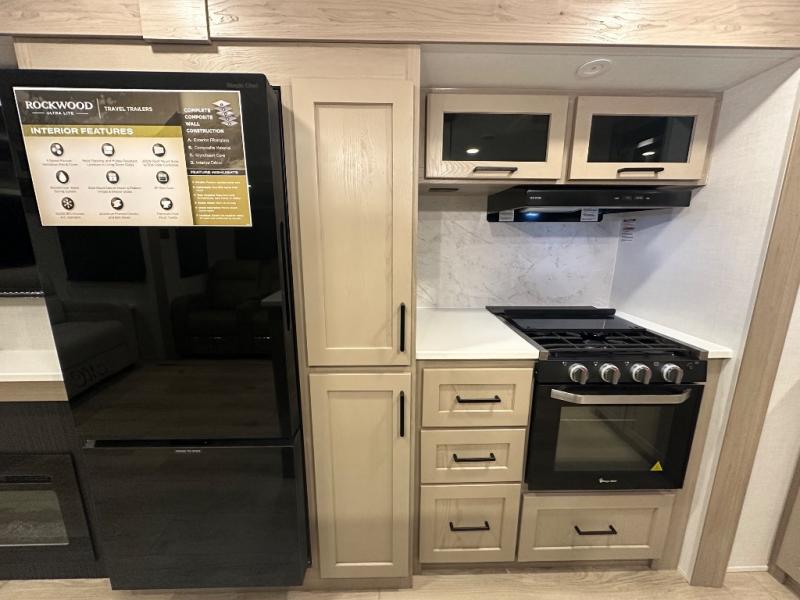 Each Rockwood Ultra Lite travel trailer by Forest River includes superior construction with a high gloss fiberglass cap, aluminum cage construction, and a power awning with LED lighting for a cozy and functional outdoor space. The torsion axle, power tongue jack will make towing smooth and hassle-free, along with the nitrogen filled, Goodyear Endurance tires and the tire pressure monitor system. Interior comforts include kitchen sink with high rise faucet, hidden hinge cabinet doors, and roller shades to name a few. Choose a Rockwood Ultra Lite travel trailer today!