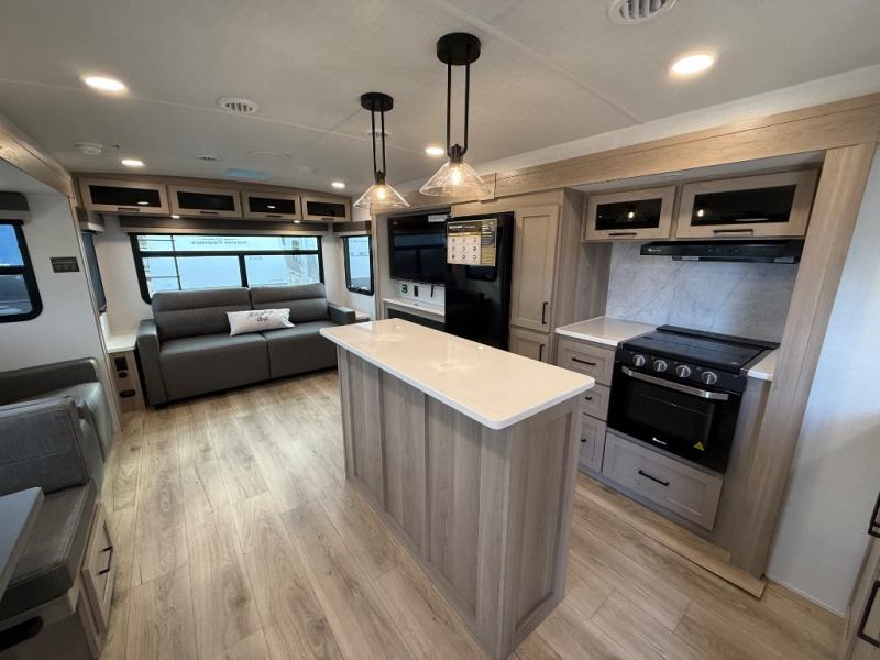 This Forest River Rockwood Ultra Lite 2906RL travel trailer is designed for comfort and space, featuring dual opposing slides in the main living area that open up the rear living room for everyone to gather. Whether you're relaxing on the hide-a-bed sofa, kicking back in the theater seats, or enjoying a meal at the booth dinette, there's room for the whole gang. The kitchen island adds extra counter space, perfect for laying out plates and creating a buffet-style spread. Up front, the private bedroom offers a queen bed and two wardrobes, giving you plenty of storage for clothes and essentials. Along with two awnings outside, you can enjoy morning sunrises or evening sunsets with friends and family.