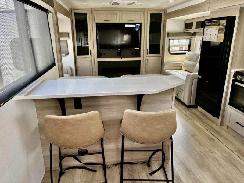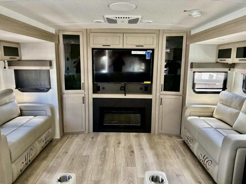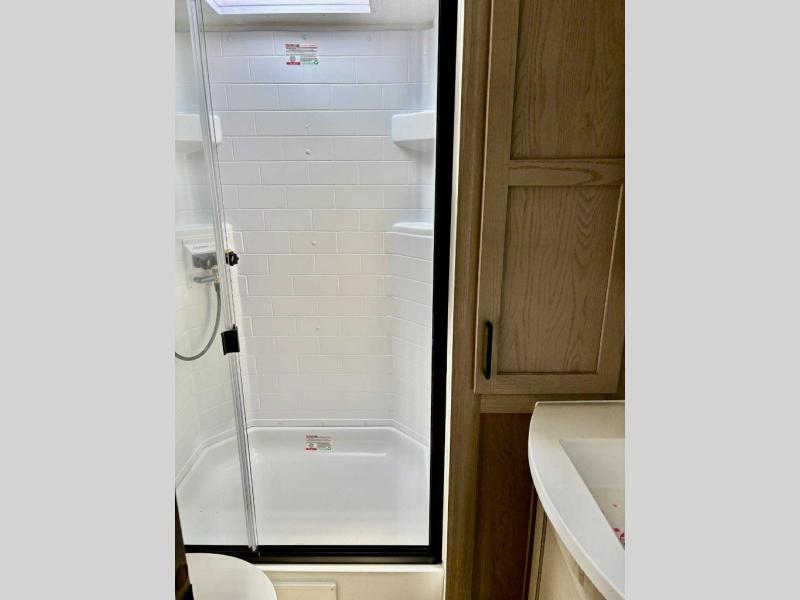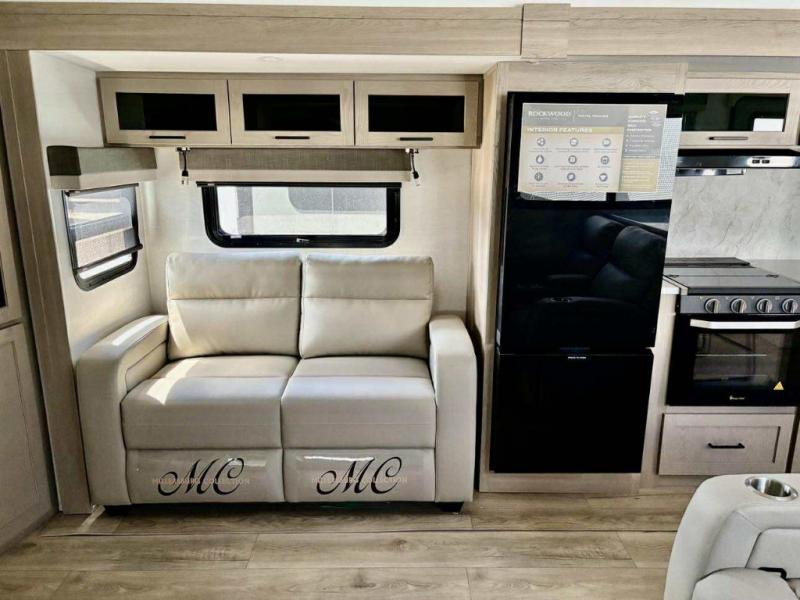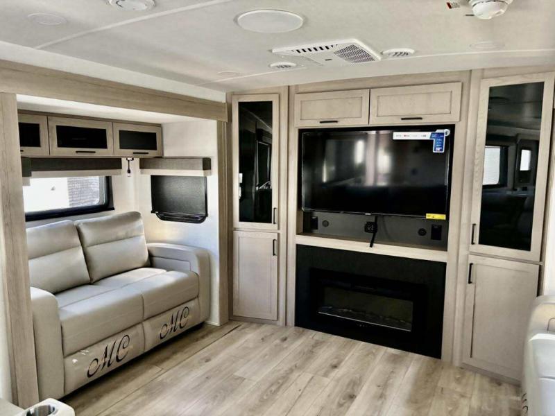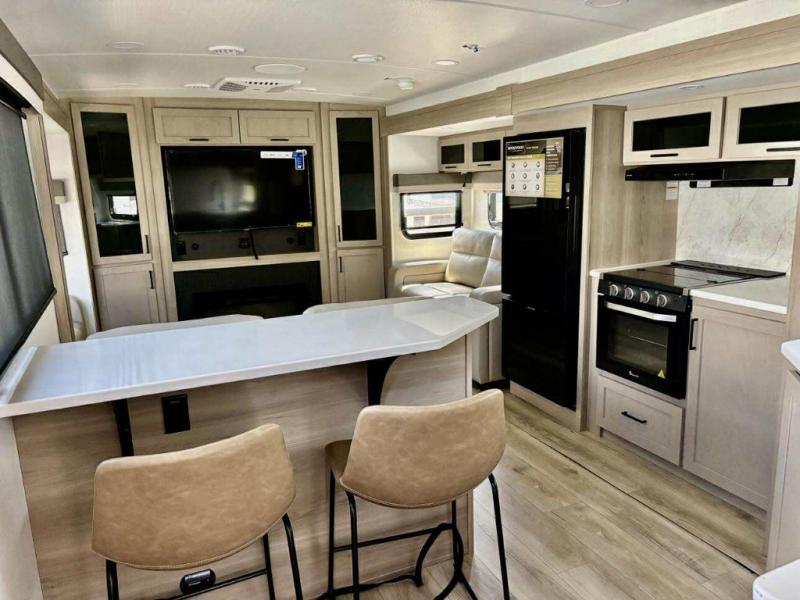 Enjoy trips to the lake in this travel trailer with triple slides! The rear living area includes a rear entertainment center, a 60" theater seat, plus two hide-a-bed sofas, which allows this room to double as your guests' bedroom at night. You'll enjoy the front private bedroom all to yourselves, and the full bath is close by for convenience. The chef of your group will love the full kitchen with a three burner range, a 21" gas oven, and a 12V refrigerator to hold perishables. And don't overlook the exterior with its outside storage, 21' awning, and exterior griddle!