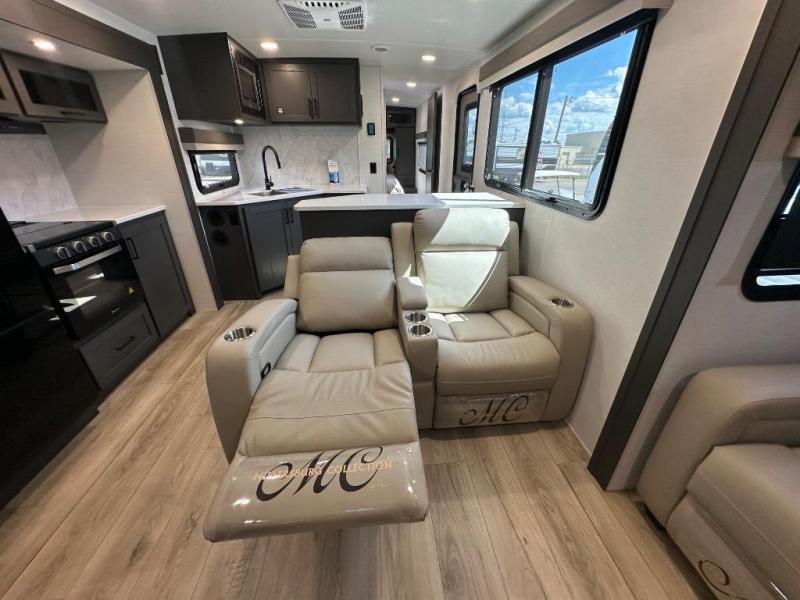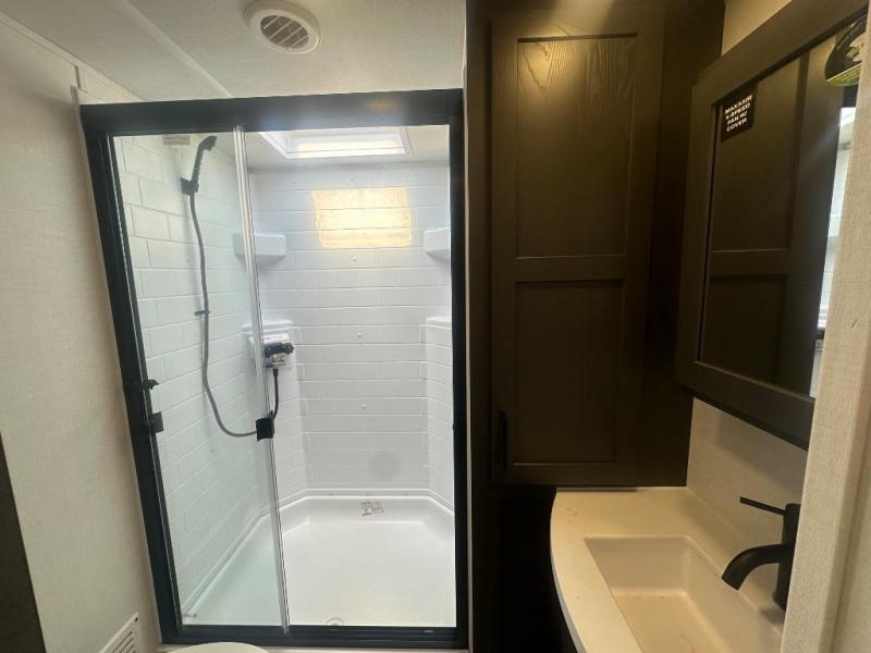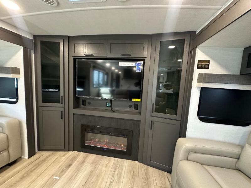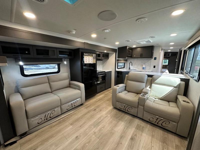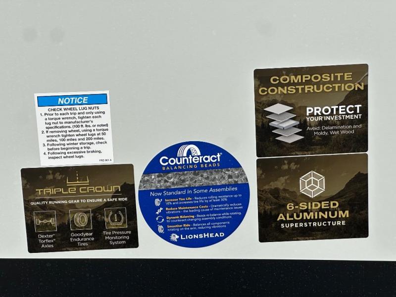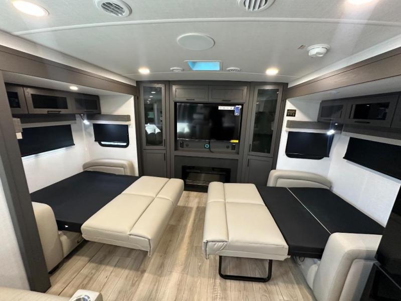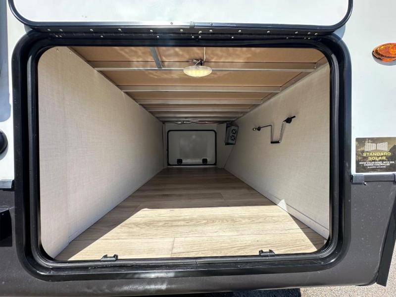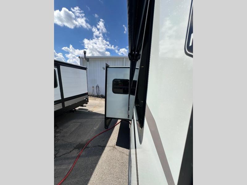 Enjoy trips to the lake in this travel trailer with triple slides! The rear living area includes a rear entertainment center, a 60" theater seat, plus two hide-a-bed sofas, which allows this room to double as your guests' bedroom at night. You'll enjoy the front private bedroom all to yourselves, and the full bath is close by for convenience. The chef of your group will love the full kitchen with a three burner range, a 21" gas oven, and a 12V refrigerator to hold perishables. And don't overlook the exterior with its outside storage, 21' awning, and exterior griddle!