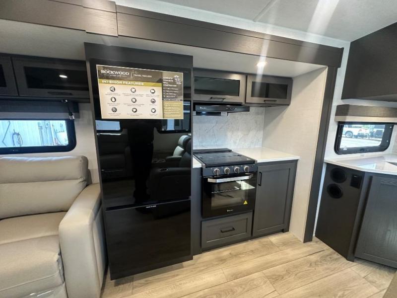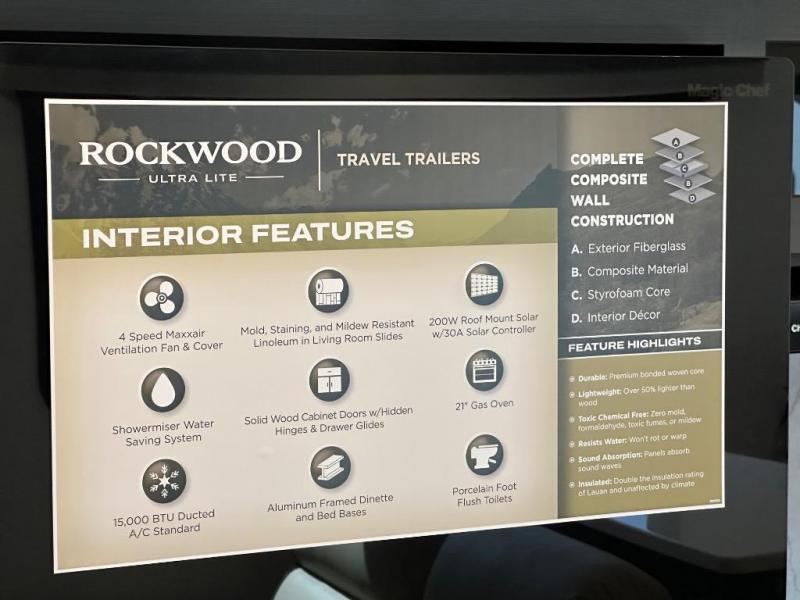 Each Rockwood Ultra Lite travel trailer by Forest River includes superior construction with a high gloss front cap, laminated white fiberglass sidewalls, and tinted frameless windows for a sleek look. The torsion axle, Rubber-Ryde suspension will make towing smooth and hassle-free, along with the nitrogen filled, Goodyear Endurance tires and the tire pressure monitor system. Interior comforts include designer kitchen backsplash, solid wood cabinet doors with hidden hinges, and night roller shades to name a few. Choose a Rockwood Ultra Lite travel trailer today!
