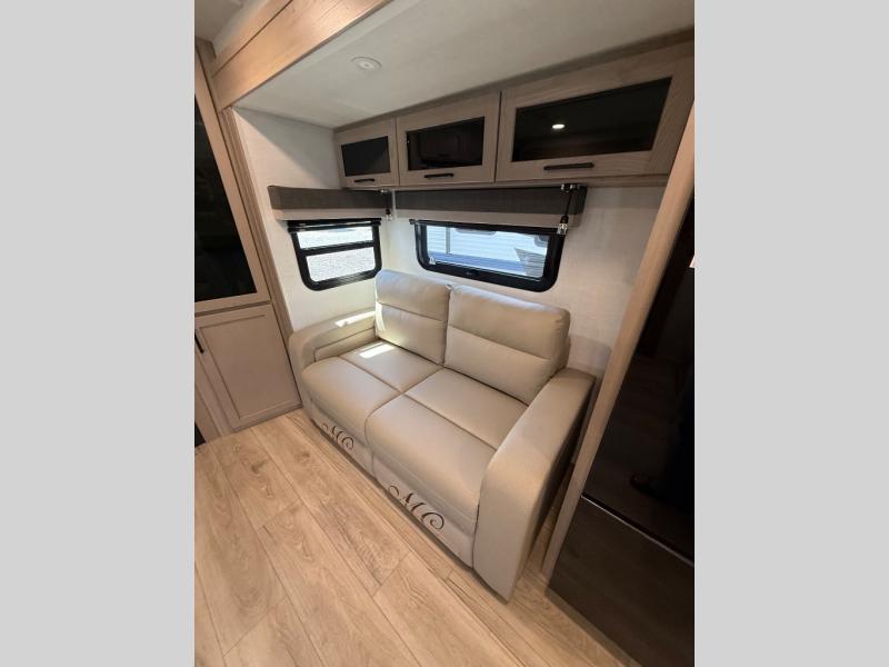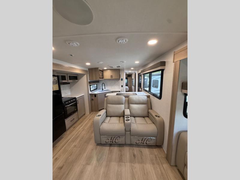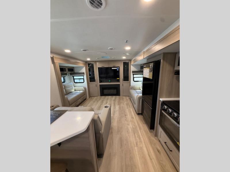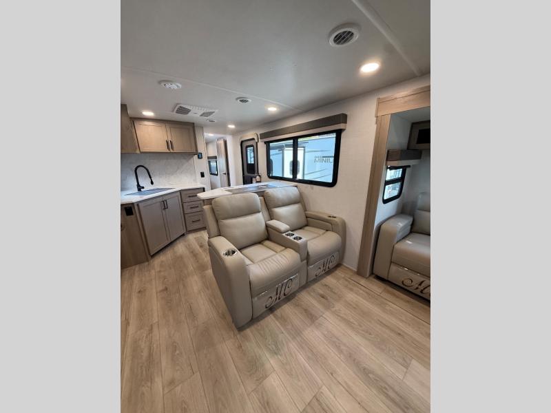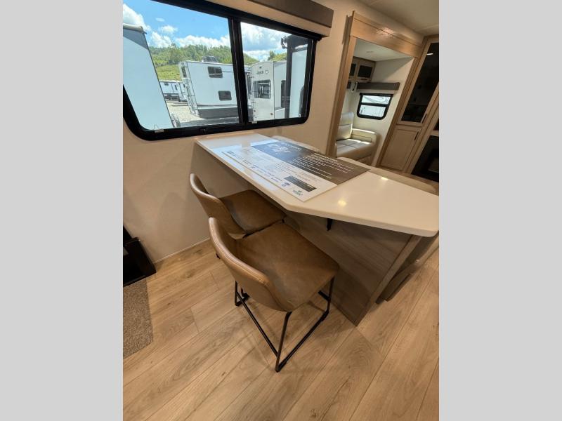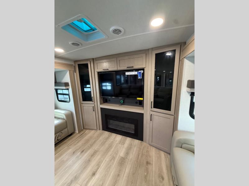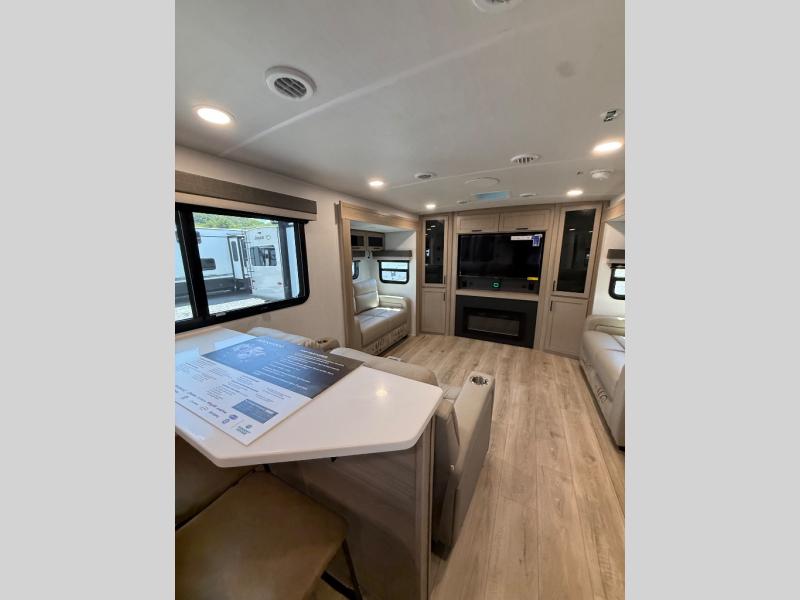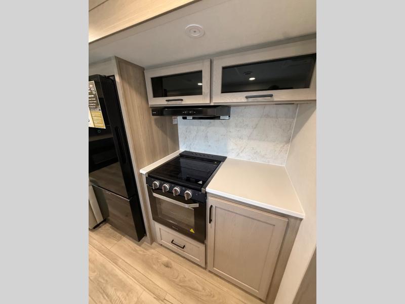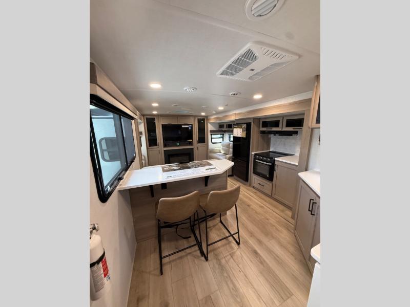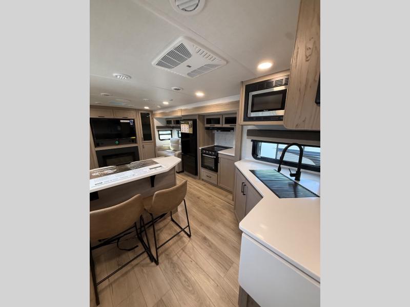 With dual slides at the rear, this Rockwood Ultra Lite travel trailer offers a spacious living area for entertaining or relaxing. Gather the whole gang for movie night with three cozy seating options facing the TV and fireplace, including two 60" hide-a-bed sofas and a 60" theater seat. A table with bar stools adds more seating and doubles as a dining spot, overlooking the TV. Overhead storage throughout the living area and kitchen provides plenty of room to stow away groceries, dishes, books, and board games, keeping everything organized. Let´s not forget the full bathroom with a large shower offers a comfortable place to refresh, while the front bedroom features a queen bed and two wardrobes for storing all your essentials.