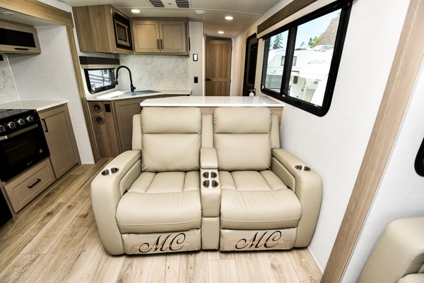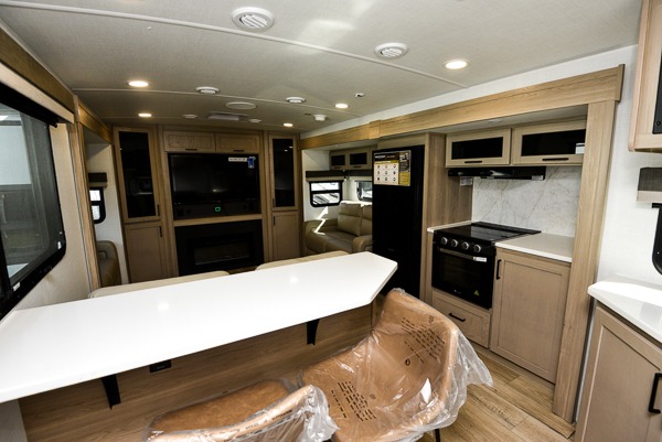 With dual slides at the rear, this Rockwood Ultra Lite travel trailer offers a spacious living area for entertaining or relaxing. Gather the whole gang for movie night with three cozy seating options facing the TV and fireplace, including two 60" hide-a-bed sofas and a 60" theater seat. A table with bar stools adds more seating and doubles as a dining spot, overlooking the TV. Overhead storage throughout the living area and kitchen provides plenty of room to stow away groceries, dishes, books, and board games, keeping everything organized. Let´s not forget the full bathroom with a large shower offers a comfortable place to refresh, while the front bedroom features a queen bed and two wardrobes for storing all your essentials.