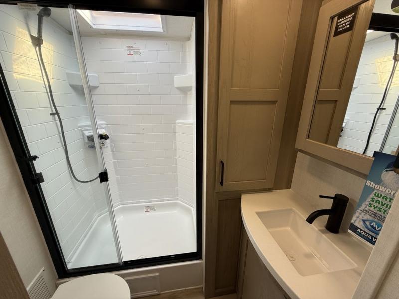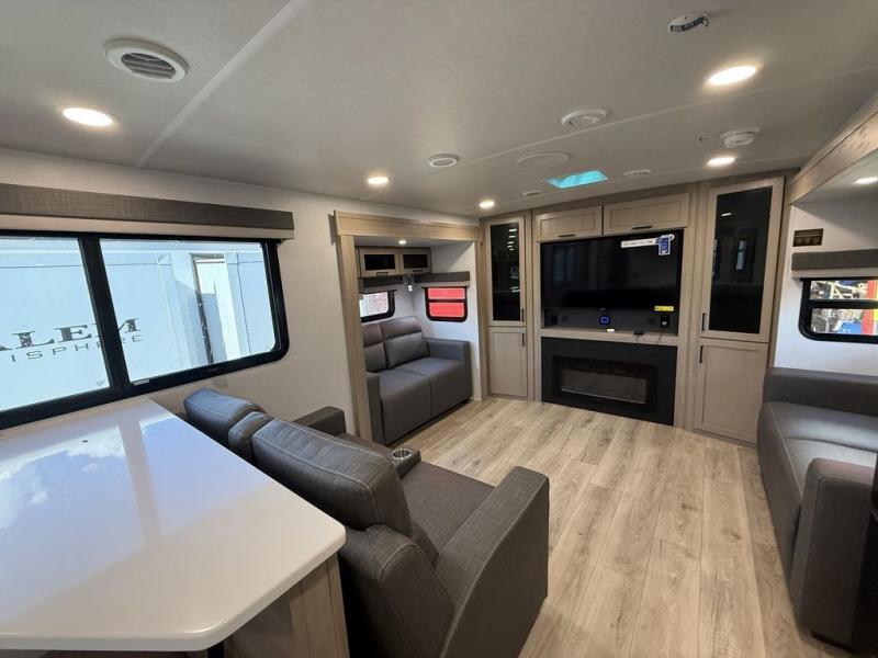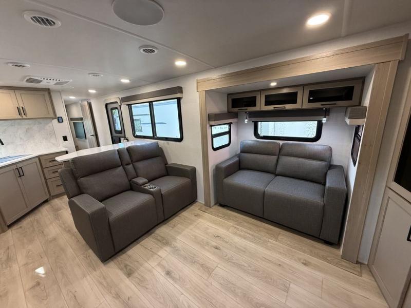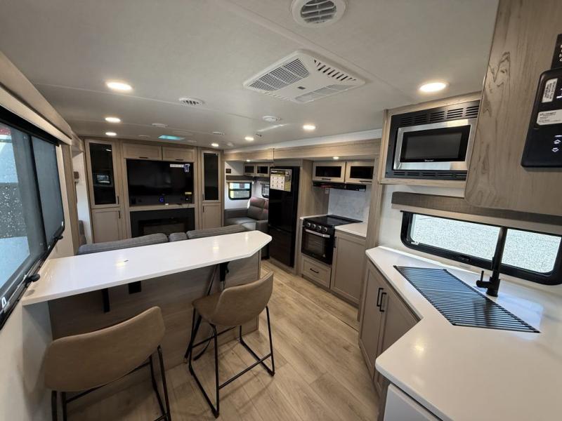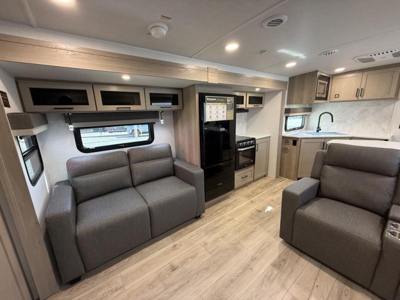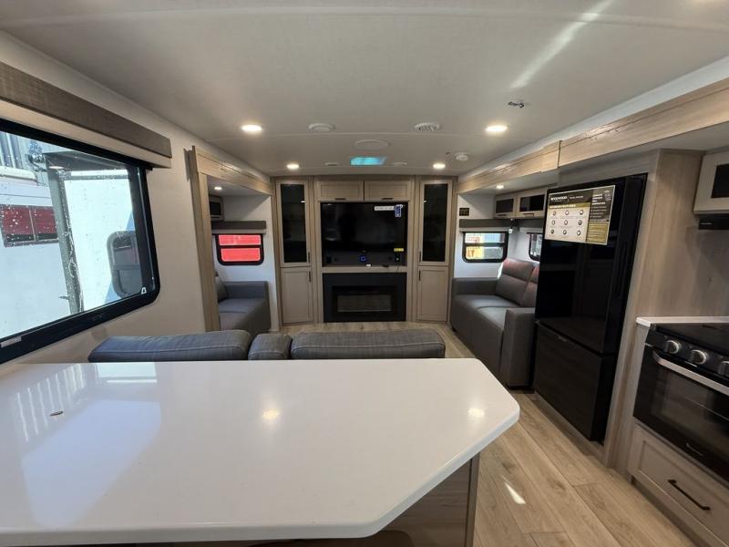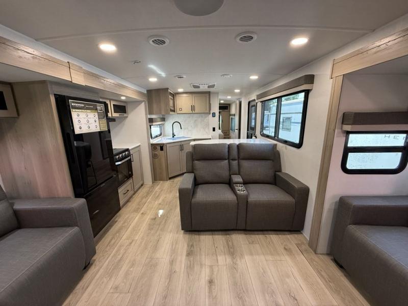 With dual slides at the rear, this Rockwood Ultra Lite travel trailer offers a spacious living area for entertaining or relaxing. Gather the whole gang for movie night with three cozy seating options facing the TV and fireplace, including two 60" hide-a-bed sofas and a 60" theater seat. A table with bar stools adds more seating and doubles as a dining spot, overlooking the TV. Overhead storage throughout the living area and kitchen provides plenty of room to stow away groceries, dishes, books, and board games, keeping everything organized. Let´s not forget the full bathroom with a large shower offers a comfortable place to refresh, while the front bedroom features a queen bed and two wardrobes for storing all your essentials.