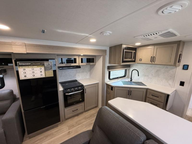 Each Rockwood Ultra Lite travel trailer by Forest River includes superior construction with a high gloss fiberglass cap, aluminum cage construction, and a power awning with LED lighting for a cozy and functional outdoor space. The torsion axle, power tongue jack will make towing smooth and hassle-free, along with the nitrogen filled, Goodyear Endurance tires and the tire pressure monitor system. Interior comforts include kitchen sink with high rise faucet, hidden hinge cabinet doors, and roller shades to name a few. Choose a Rockwood Ultra Lite travel trailer today!