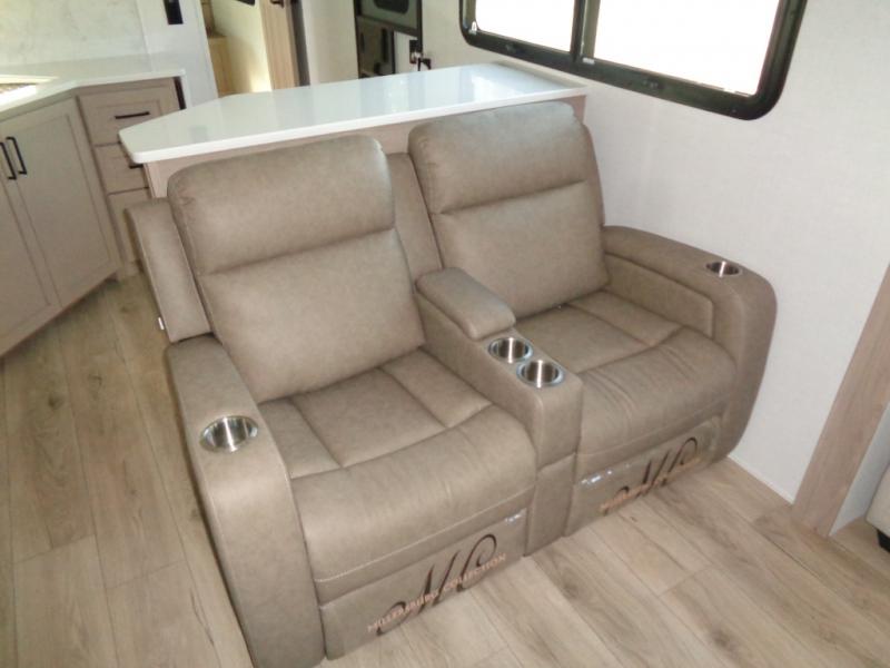 With dual slides at the rear, this Rockwood Ultra Lite travel trailer offers a spacious living area for entertaining or relaxing. Gather the whole gang for movie night with three cozy seating options facing the TV and fireplace, including two 60" hide-a-bed sofas and a 60" theater seat. A table with bar stools adds more seating and doubles as a dining spot, overlooking the TV. Overhead storage throughout the living area and kitchen provides plenty of room to stow away groceries, dishes, books, and board games, keeping everything organized. Let´s not forget the full bathroom with a large shower offers a comfortable place to refresh, while the front bedroom features a queen bed and two wardrobes for storing all your essentials.