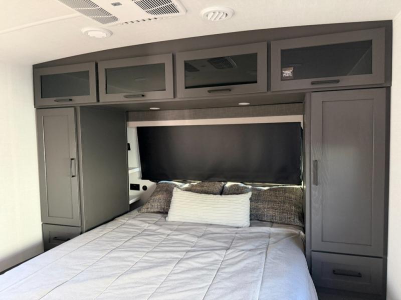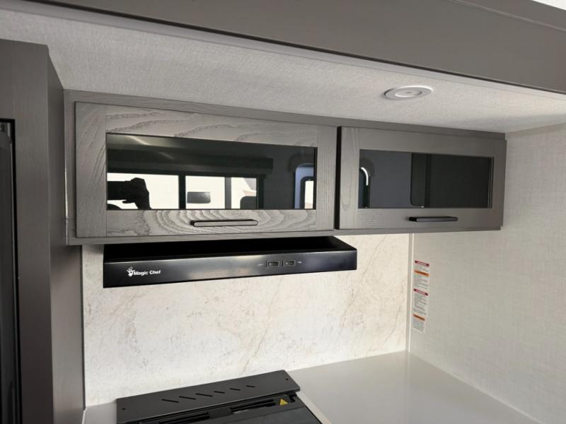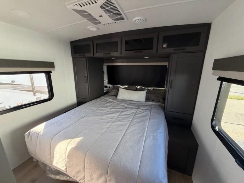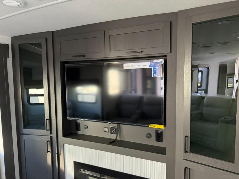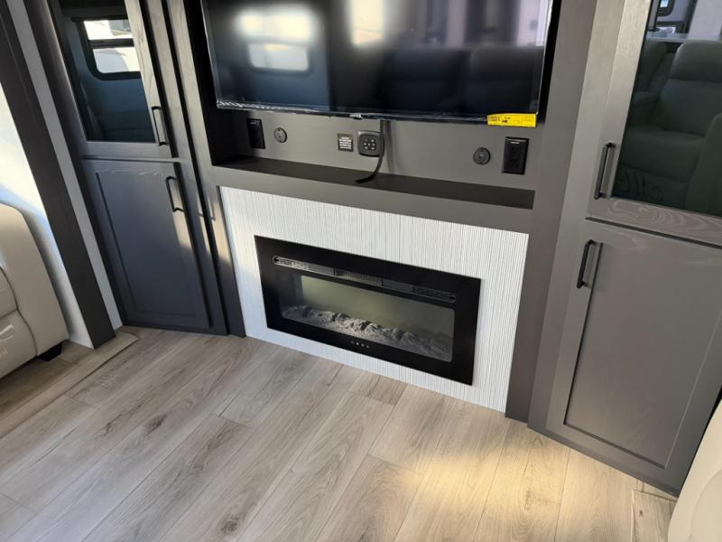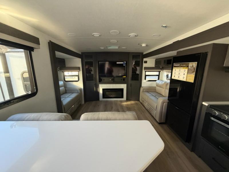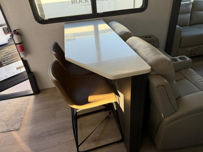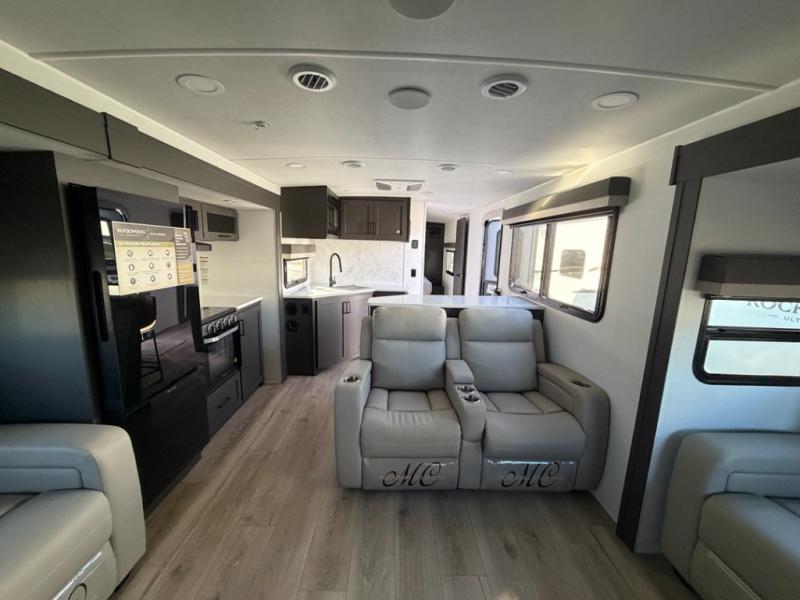 With dual slides at the rear, this Rockwood Ultra Lite travel trailer offers a spacious living area for entertaining or relaxing. Gather the whole gang for movie night with three cozy seating options facing the TV and fireplace, including two 60" hide-a-bed sofas and a 60" theater seat. A table with bar stools adds more seating and doubles as a dining spot, overlooking the TV. Overhead storage throughout the living area and kitchen provides plenty of room to stow away groceries, dishes, books, and board games, keeping everything organized. Let´s not forget the full bathroom with a large shower offers a comfortable place to refresh, while the front bedroom features a queen bed and two wardrobes for storing all your essentials.