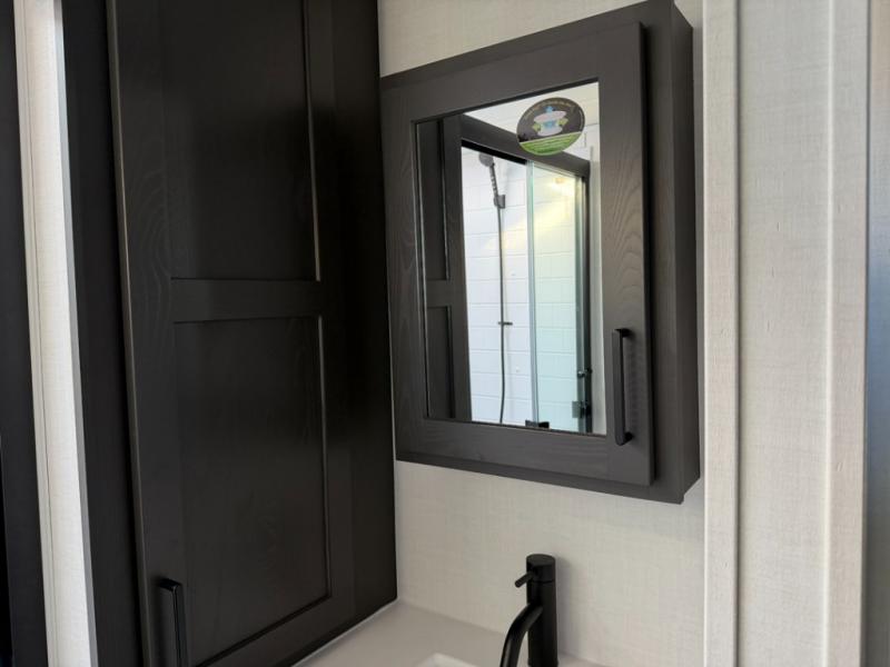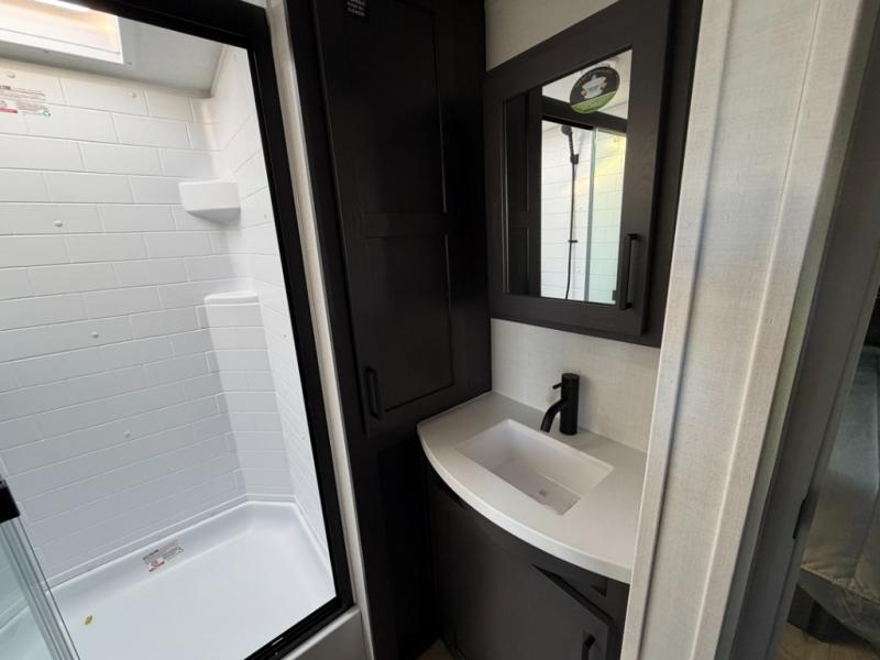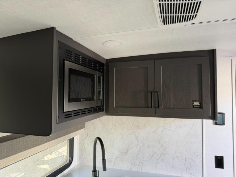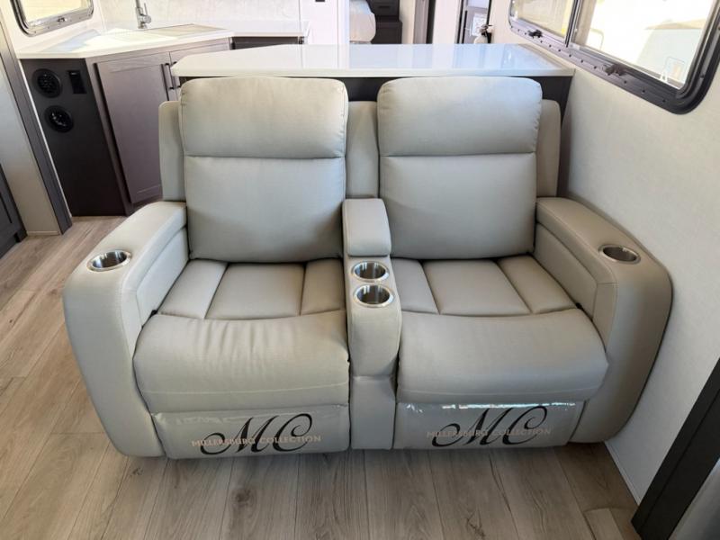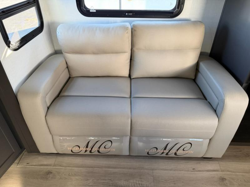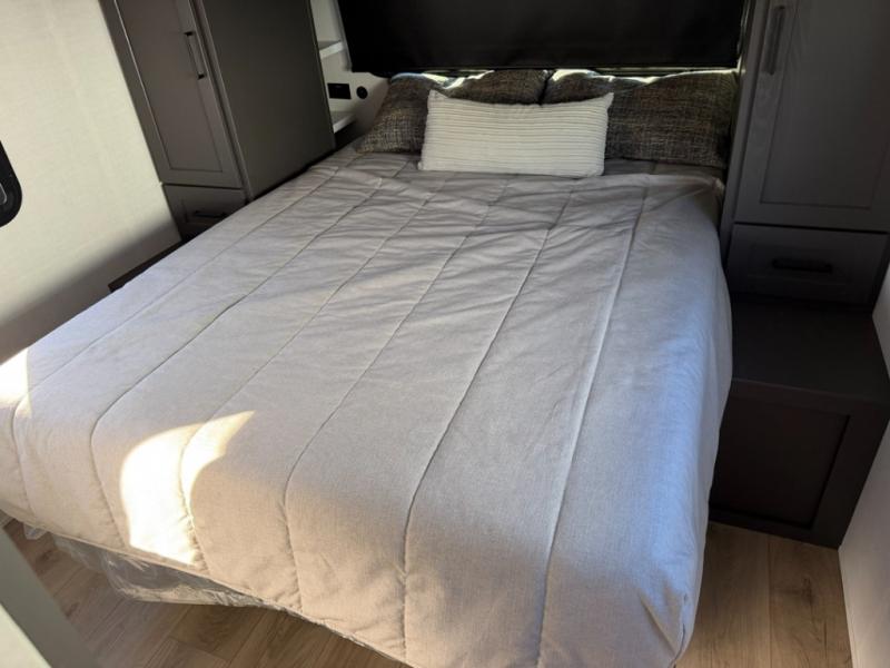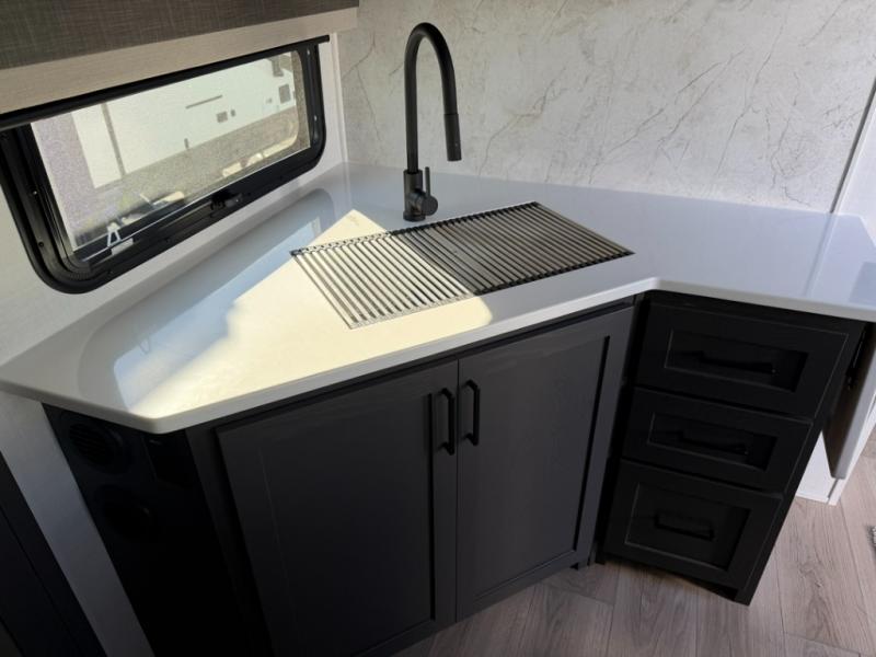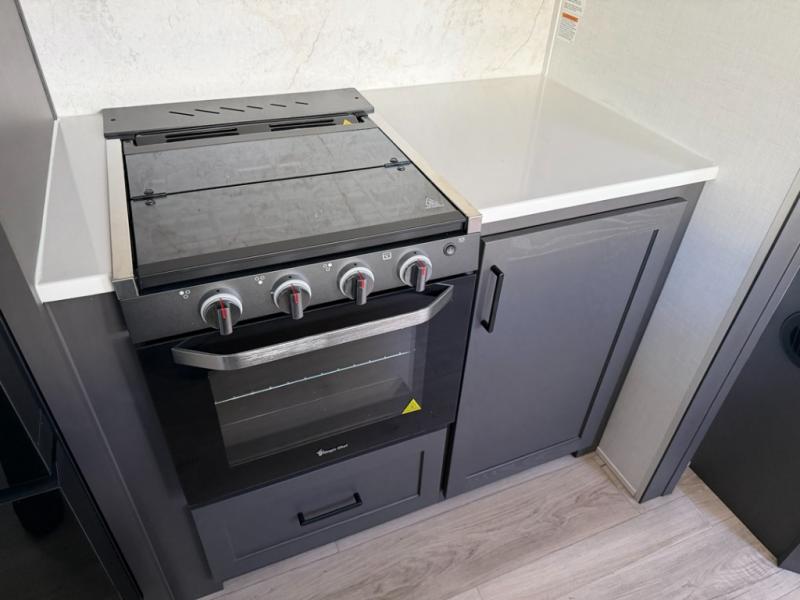 With dual slides at the rear, this Rockwood Ultra Lite travel trailer offers a spacious living area for entertaining or relaxing. Gather the whole gang for movie night with three cozy seating options facing the TV and fireplace, including two 60" hide-a-bed sofas and a 60" theater seat. A table with bar stools adds more seating and doubles as a dining spot, overlooking the TV. Overhead storage throughout the living area and kitchen provides plenty of room to stow away groceries, dishes, books, and board games, keeping everything organized. Let´s not forget the full bathroom with a large shower offers a comfortable place to refresh, while the front bedroom features a queen bed and two wardrobes for storing all your essentials.