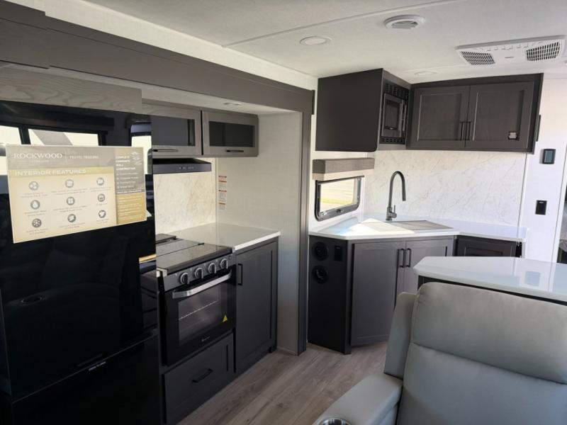 Each Rockwood Ultra Lite travel trailer by Forest River includes superior construction with a high gloss fiberglass cap, aluminum cage construction, and a power awning with LED lighting for a cozy and functional outdoor space. The torsion axle, power tongue jack will make towing smooth and hassle-free, along with the nitrogen filled, Goodyear Endurance tires and the tire pressure monitor system. Interior comforts include kitchen sink with high rise faucet, hidden hinge cabinet doors, and roller shades to name a few. Choose a Rockwood Ultra Lite travel trailer today!