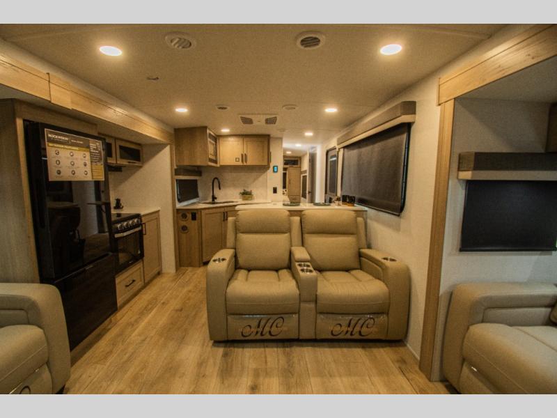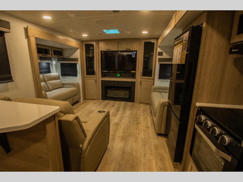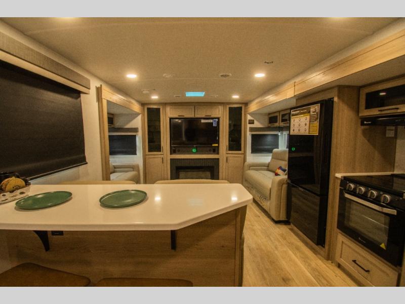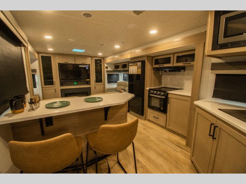 With dual slides at the rear, this Rockwood Ultra Lite travel trailer offers a spacious living area for entertaining or relaxing. Gather the whole gang for movie night with three cozy seating options facing the TV and fireplace, including two 60" hide-a-bed sofas and a 60" theater seat. A table with bar stools adds more seating and doubles as a dining spot, overlooking the TV. Overhead storage throughout the living area and kitchen provides plenty of room to stow away groceries, dishes, books, and board games, keeping everything organized. Let´s not forget the full bathroom with a large shower offers a comfortable place to refresh, while the front bedroom features a queen bed and two wardrobes for storing all your essentials.