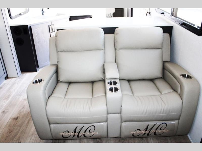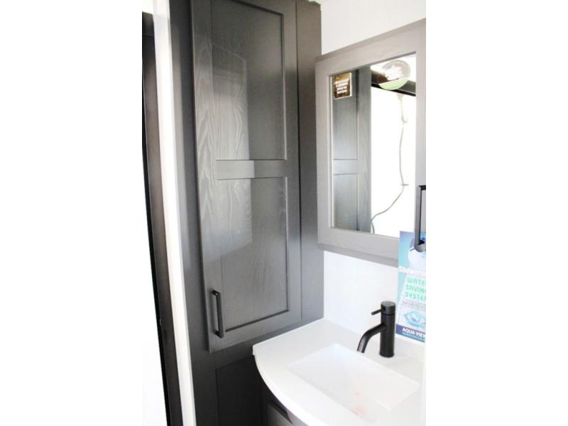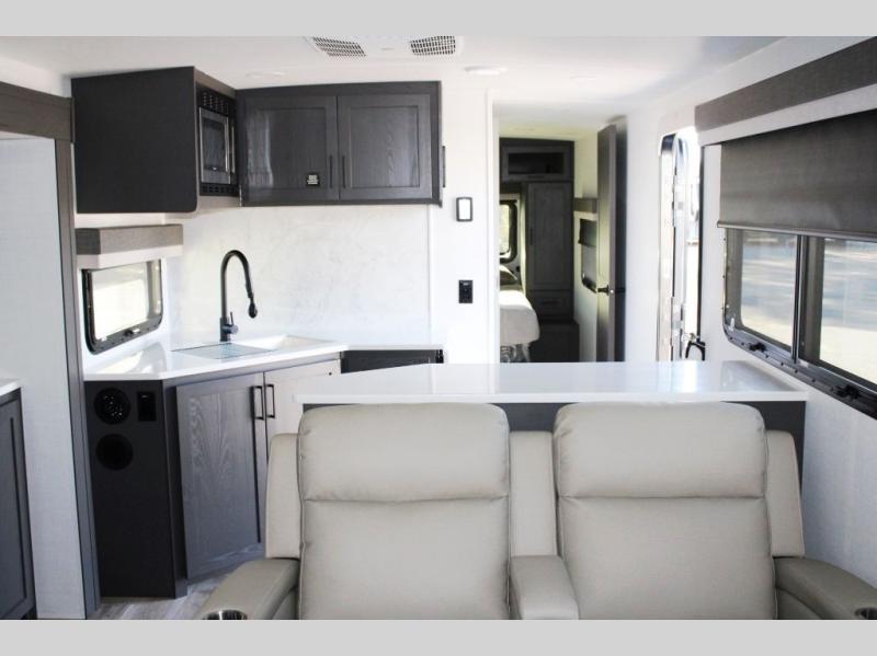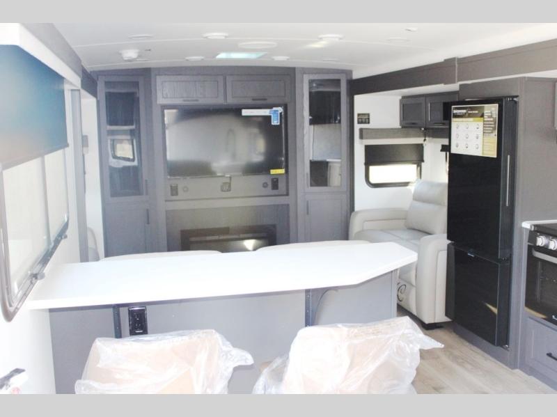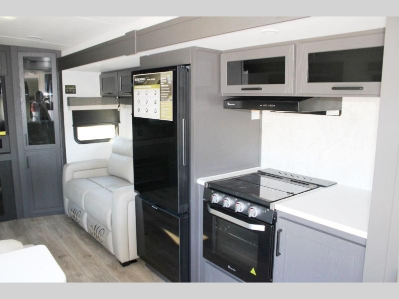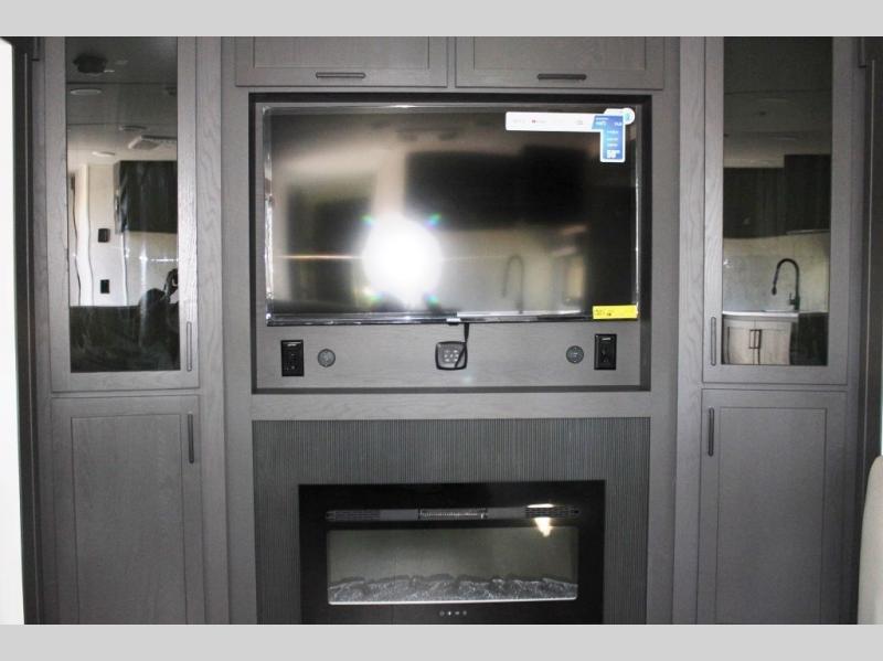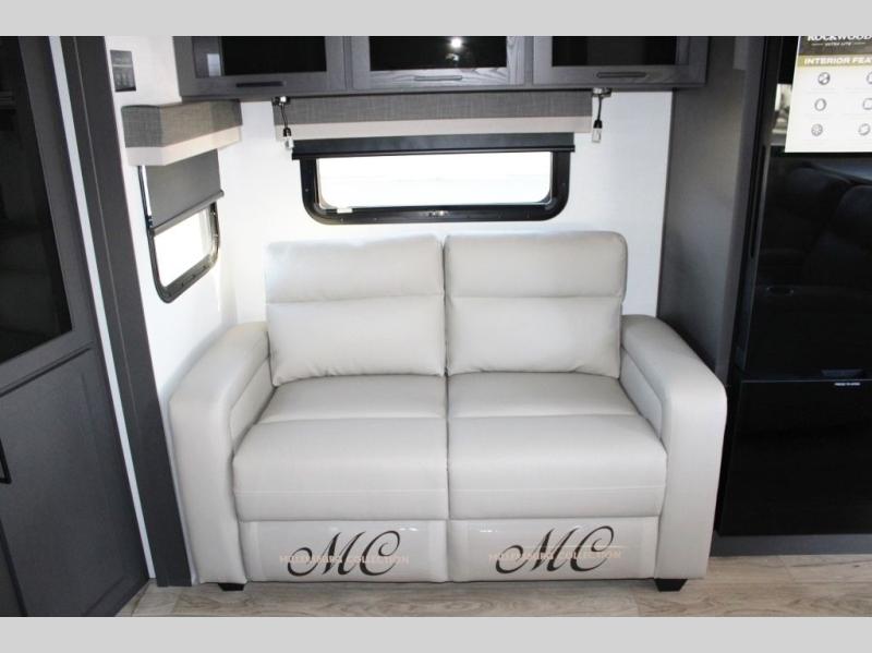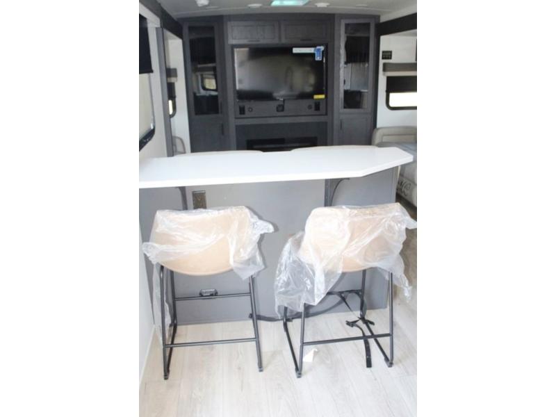 With dual slides at the rear, this Rockwood Ultra Lite travel trailer offers a spacious living area for entertaining or relaxing. Gather the whole gang for movie night with three cozy seating options facing the TV and fireplace, including two 60" hide-a-bed sofas and a 60" theater seat. A table with bar stools adds more seating and doubles as a dining spot, overlooking the TV. Overhead storage throughout the living area and kitchen provides plenty of room to stow away groceries, dishes, books, and board games, keeping everything organized. Let´s not forget the full bathroom with a large shower offers a comfortable place to refresh, while the front bedroom features a queen bed and two wardrobes for storing all your essentials.