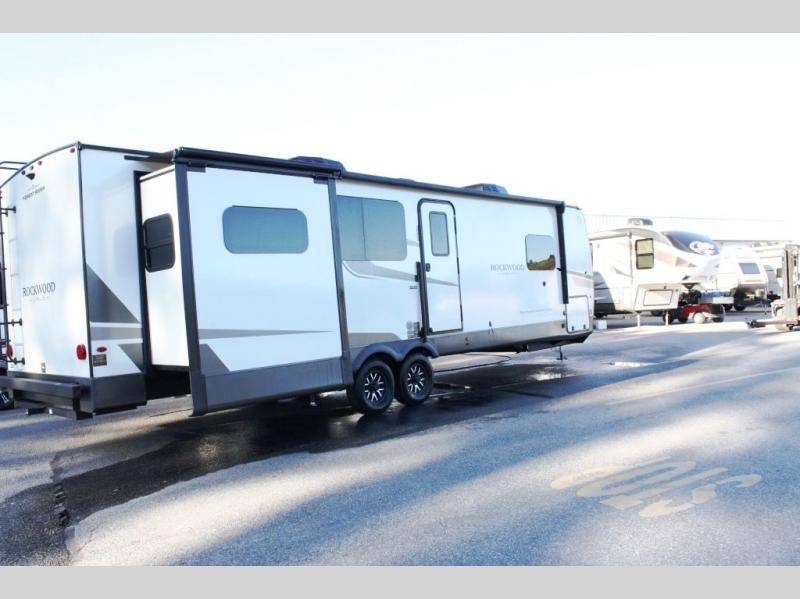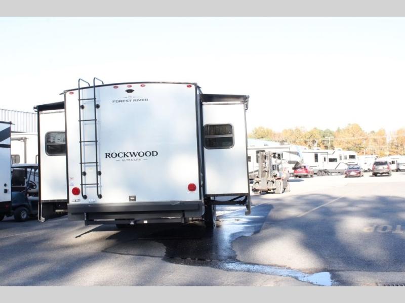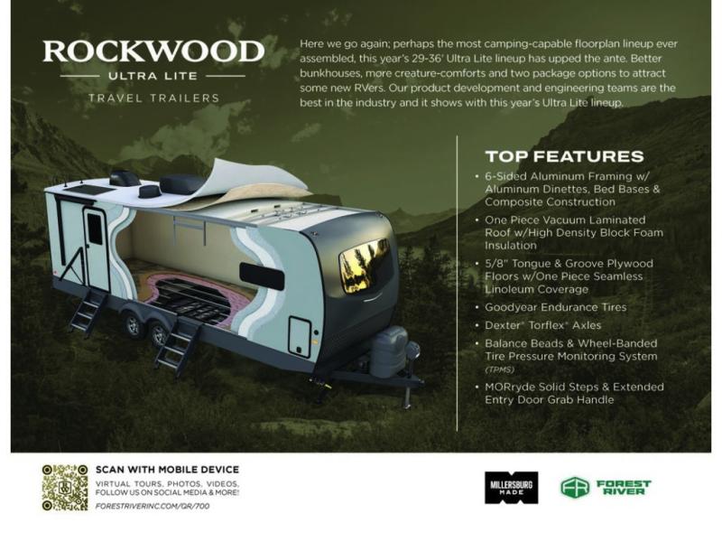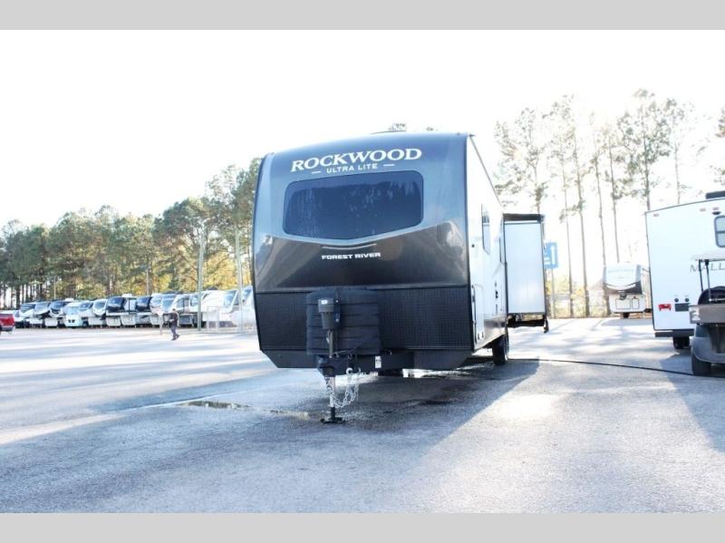 Each Rockwood Ultra Lite travel trailer by Forest River includes superior construction with a high gloss fiberglass cap, aluminum cage construction, and a power awning with LED lighting for a cozy and functional outdoor space. The torsion axle, power tongue jack will make towing smooth and hassle-free, along with the nitrogen filled, Goodyear Endurance tires and the tire pressure monitor system. Interior comforts include kitchen sink with high rise faucet, hidden hinge cabinet doors, and roller shades to name a few. Choose a Rockwood Ultra Lite travel trailer today!