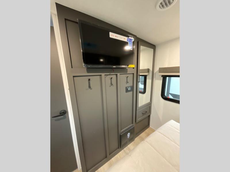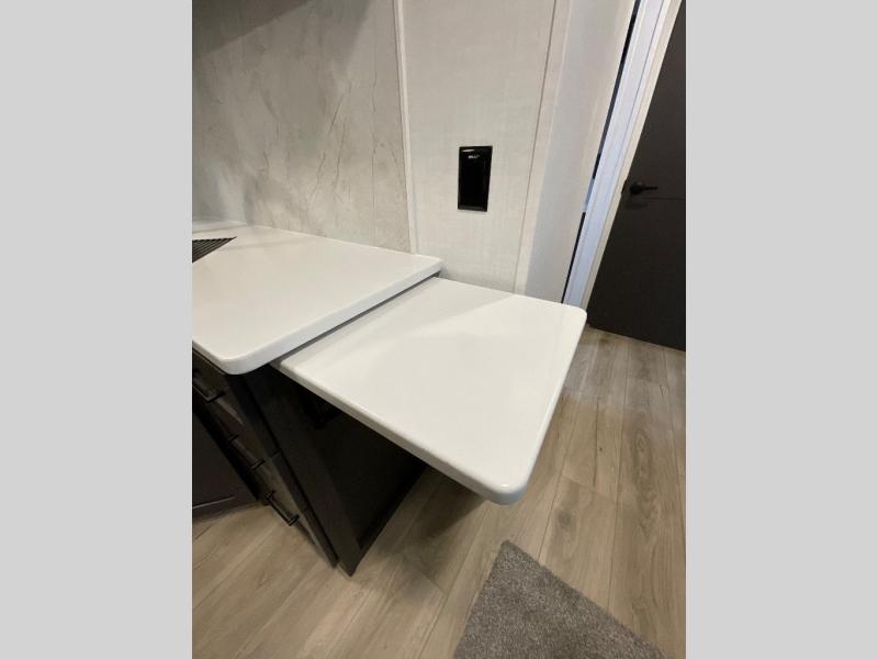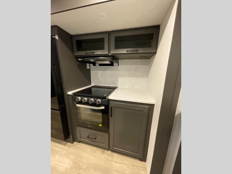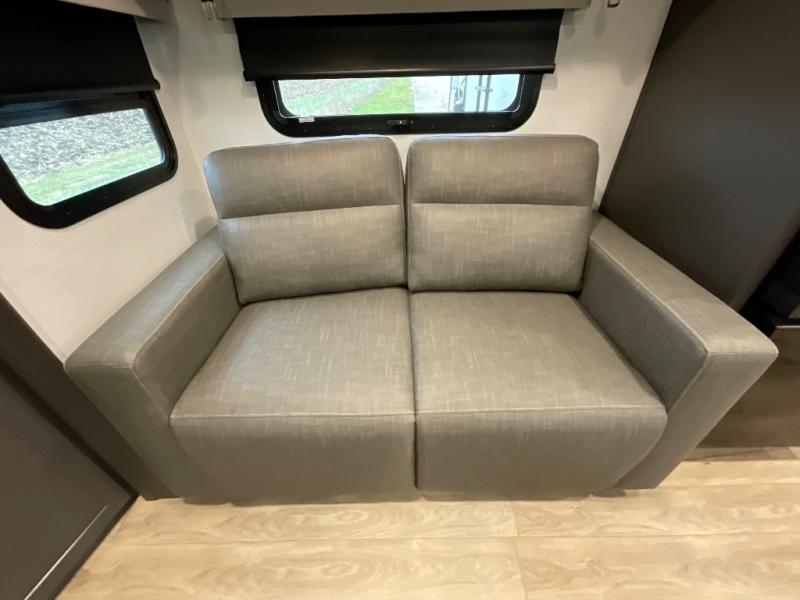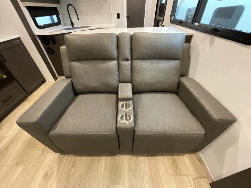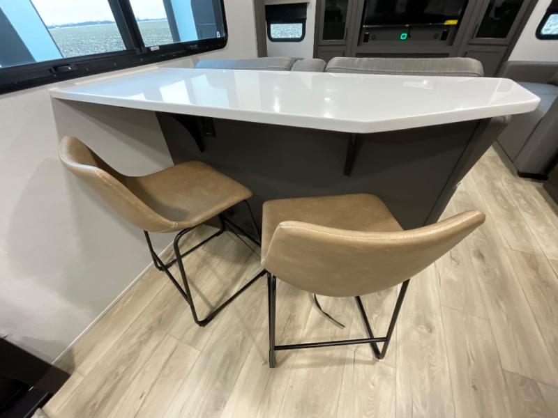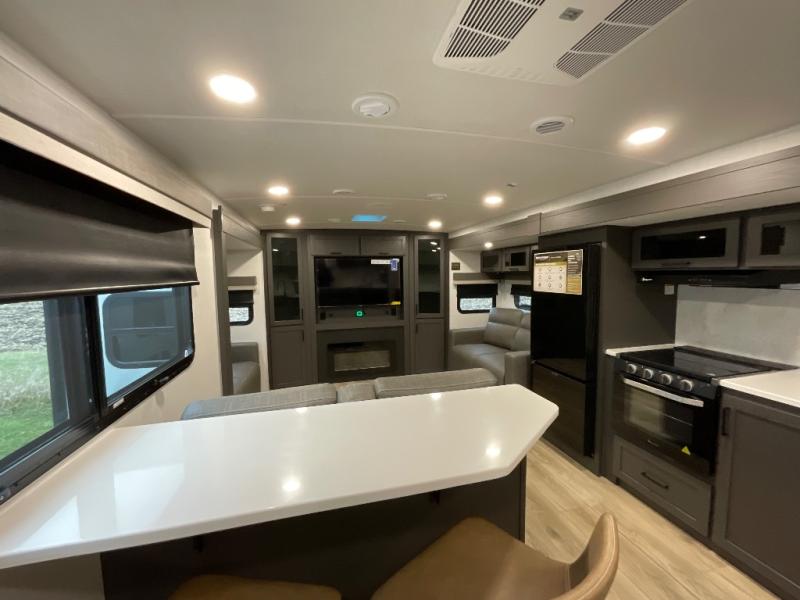 With dual slides at the rear, this Rockwood Ultra Lite travel trailer offers a spacious living area for entertaining or relaxing. Gather the whole gang for movie night with three cozy seating options facing the TV and fireplace, including two 60" hide-a-bed sofas and a 60" theater seat. A table with bar stools adds more seating and doubles as a dining spot, overlooking the TV. Overhead storage throughout the living area and kitchen provides plenty of room to stow away groceries, dishes, books, and board games, keeping everything organized. Let´s not forget the full bathroom with a large shower offers a comfortable place to refresh, while the front bedroom features a queen bed and two wardrobes for storing all your essentials.
