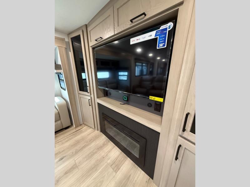Enjoy trips to the lake in this travel trailer with triple slides! The rear living area includes a rear entertainment center, a 60" theater seat, plus two hide-a-bed sofas, which allows this room to double as your guests' bedroom at night. You'll enjoy the front private bedroom all to yourselves, and the full bath is close by for convenience. The chef of your group will love the full kitchen with a three burner range, a 21" gas oven, and a 12V refrigerator to hold perishables. And don't overlook the exterior with its outside storage, 21' awning, and exterior griddle!
