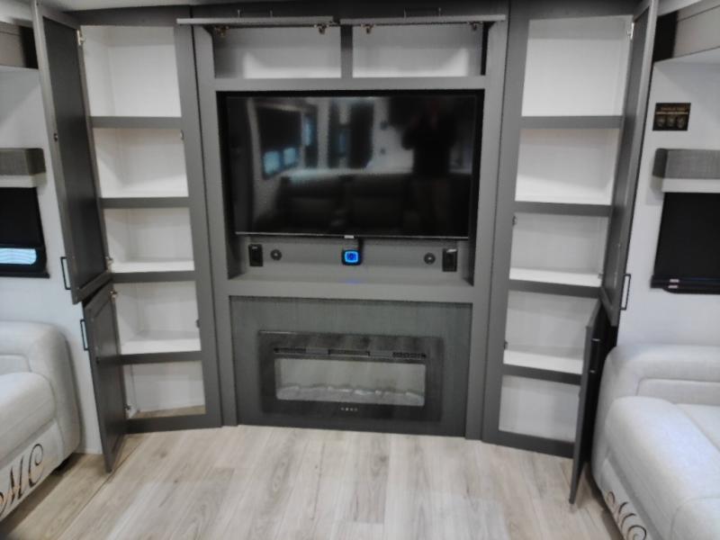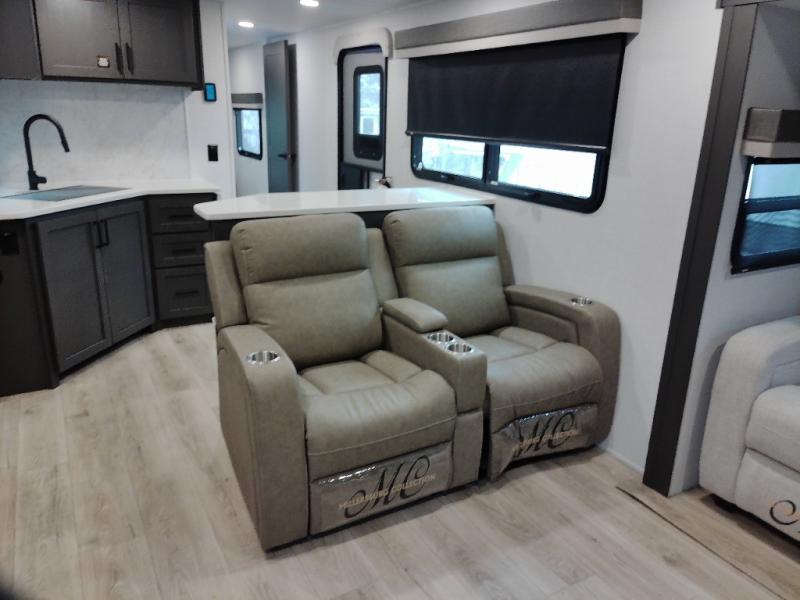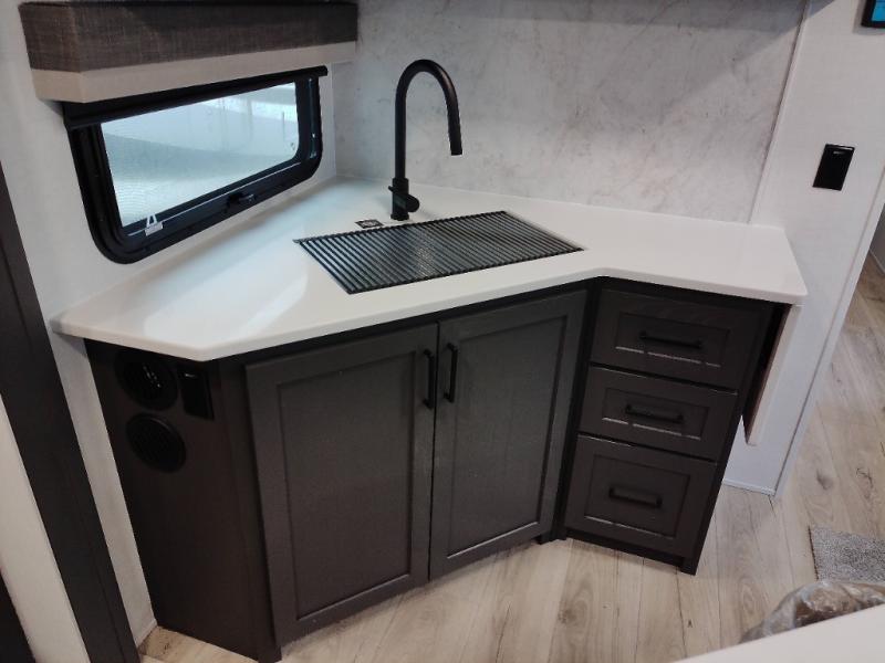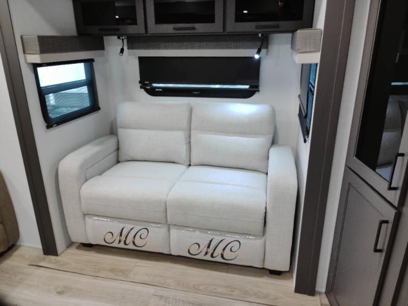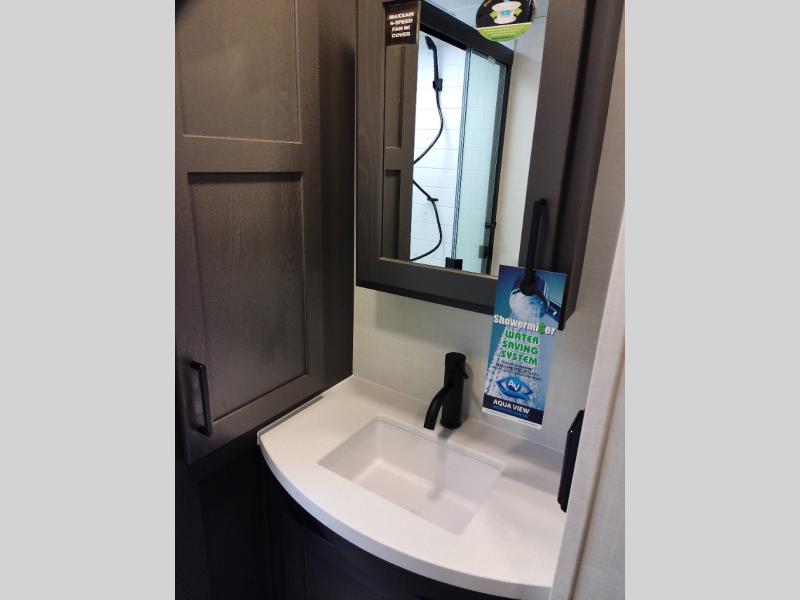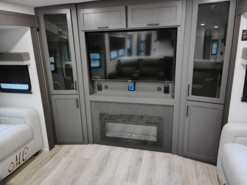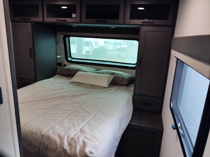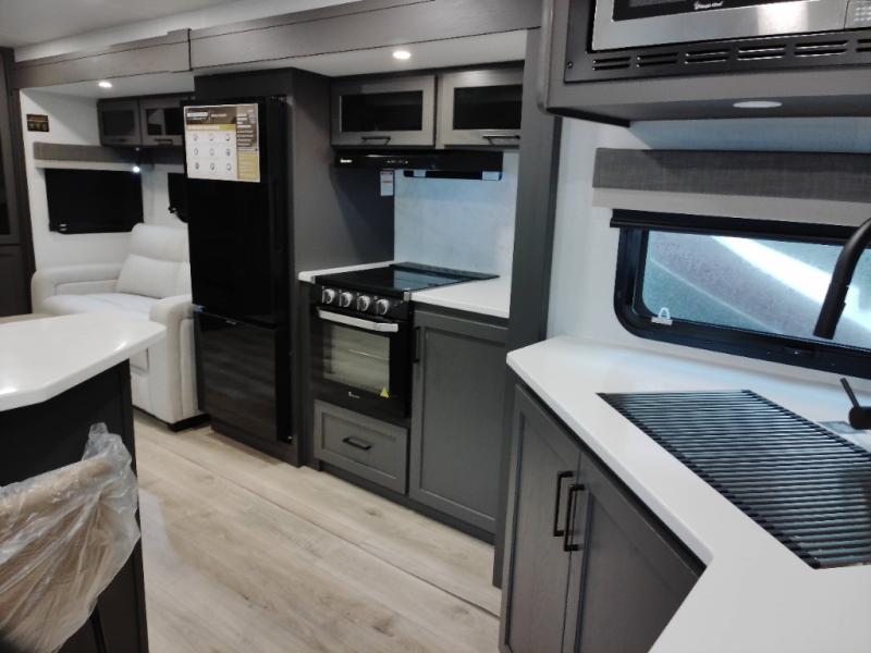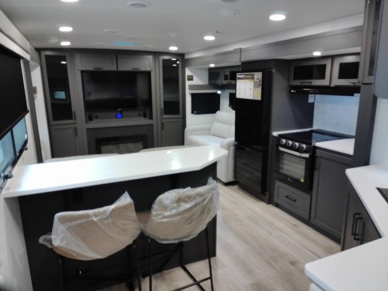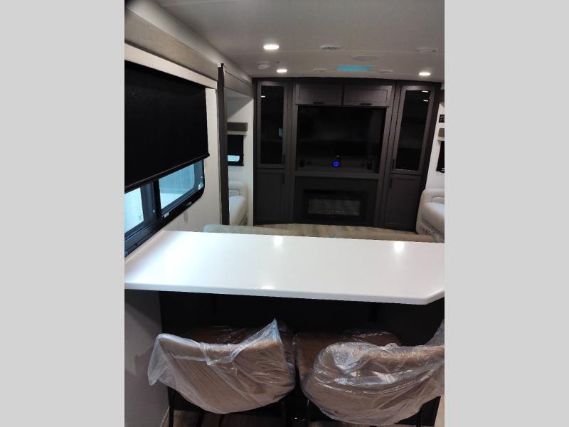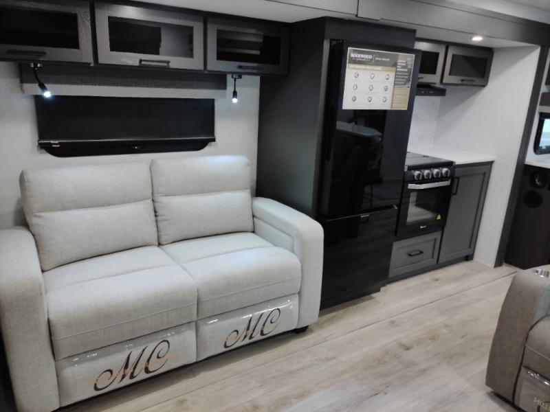 With dual slides at the rear, this Rockwood Ultra Lite travel trailer offers a spacious living area for entertaining or relaxing. Gather the whole gang for movie night with three cozy seating options facing the TV and fireplace, including two 60" hide-a-bed sofas and a 60" theater seat. A table with bar stools adds more seating and doubles as a dining spot, overlooking the TV. Overhead storage throughout the living area and kitchen provides plenty of room to stow away groceries, dishes, books, and board games, keeping everything organized. Let´s not forget the full bathroom with a large shower offers a comfortable place to refresh, while the front bedroom features a queen bed and two wardrobes for storing all your essentials.