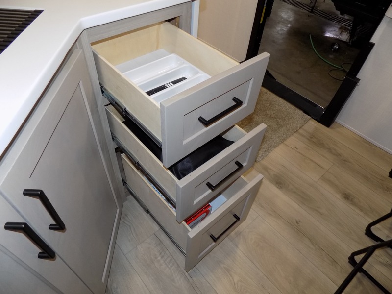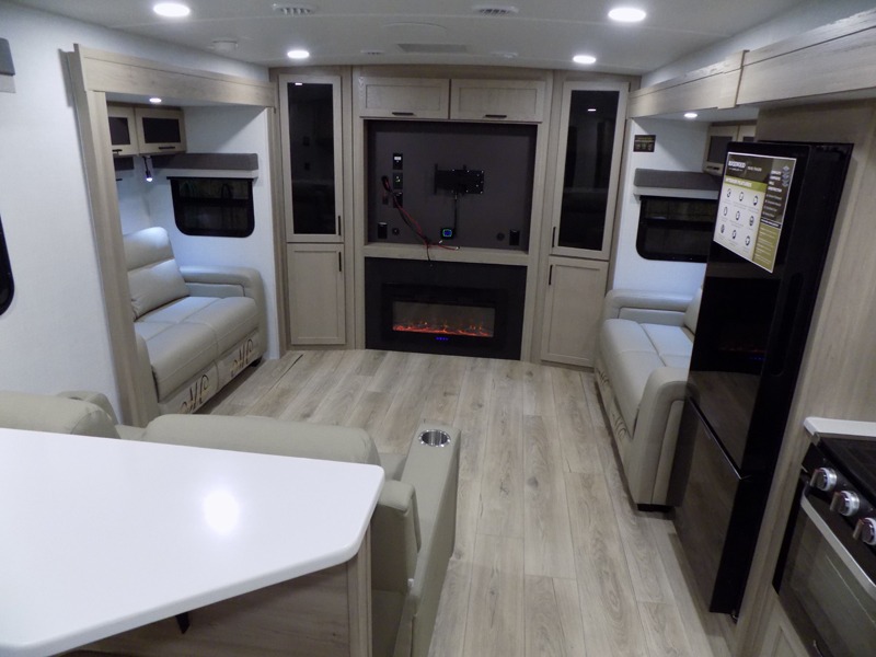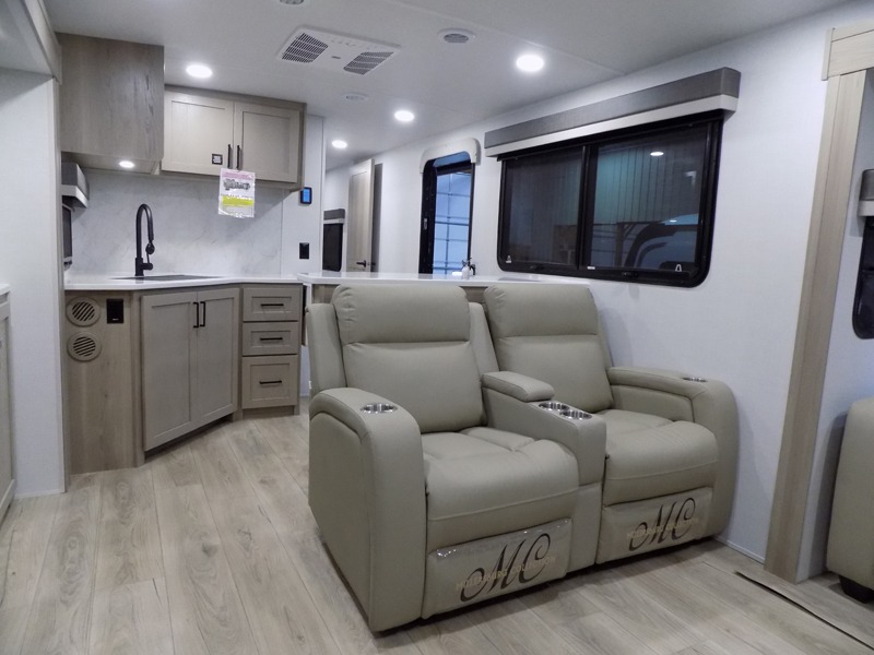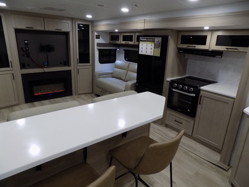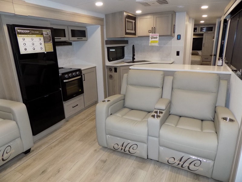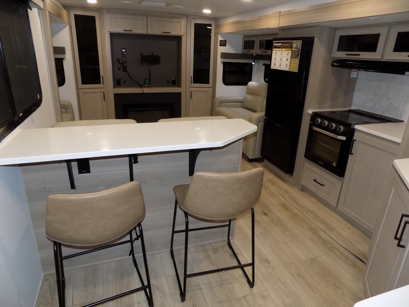 With dual slides at the rear, this Rockwood Ultra Lite travel trailer offers a spacious living area for entertaining or relaxing. Gather the whole gang for movie night with three cozy seating options facing the TV and fireplace, including two 60" hide-a-bed sofas and a 60" theater seat. A table with bar stools adds more seating and doubles as a dining spot, overlooking the TV. Overhead storage throughout the living area and kitchen provides plenty of room to stow away groceries, dishes, books, and board games, keeping everything organized. Let´s not forget the full bathroom with a large shower offers a comfortable place to refresh, while the front bedroom features a queen bed and two wardrobes for storing all your essentials.