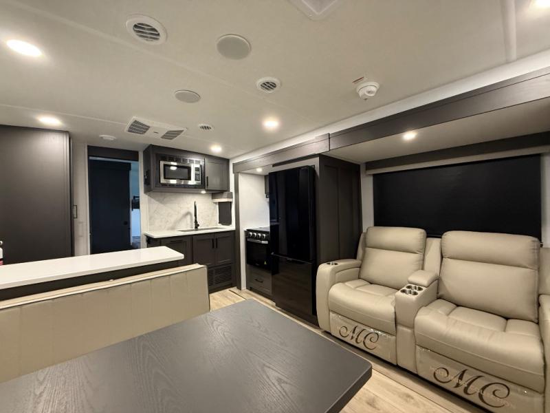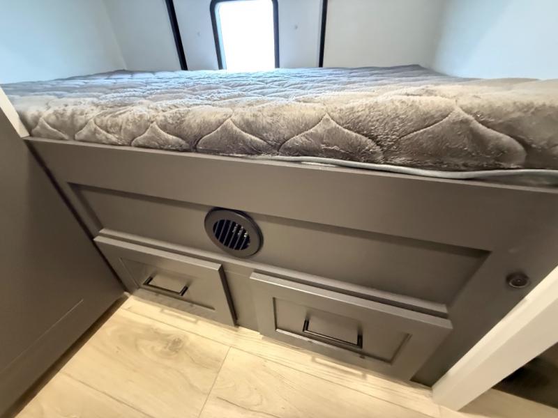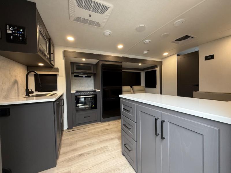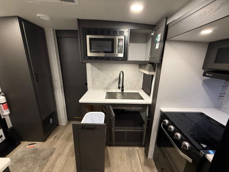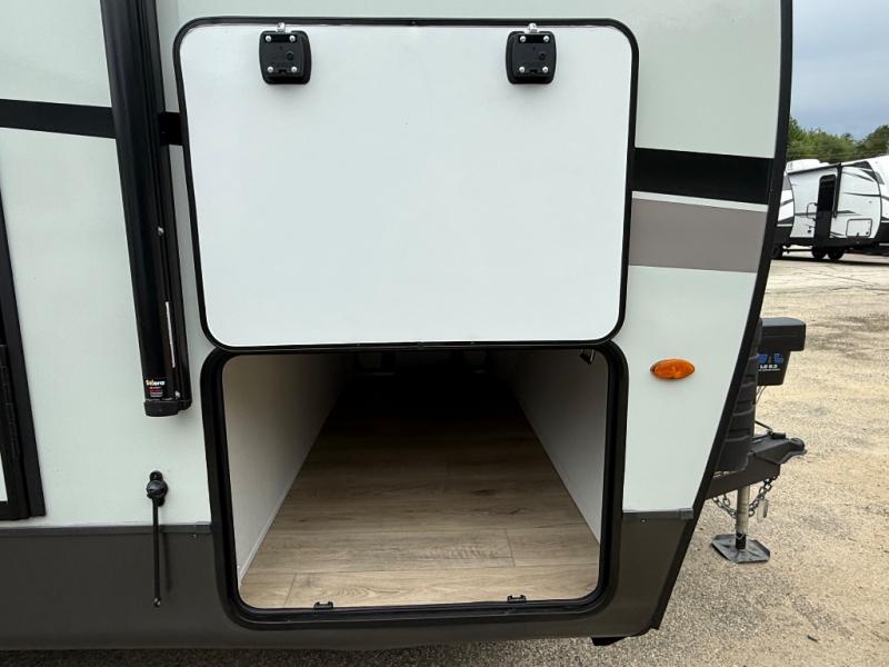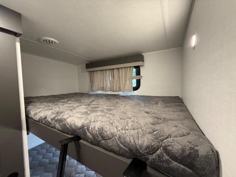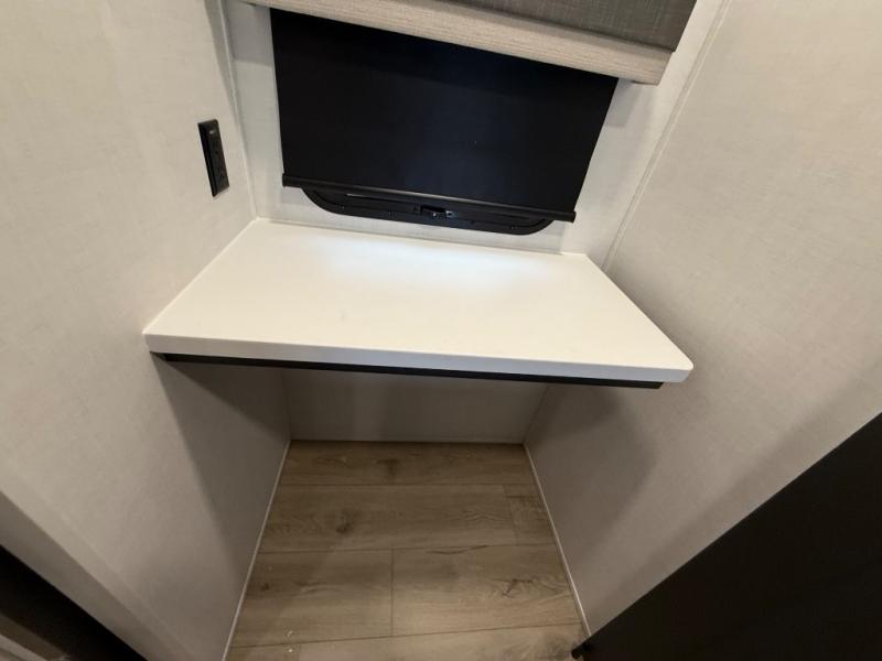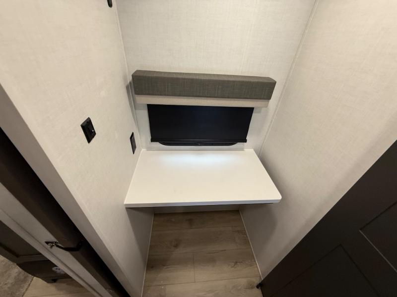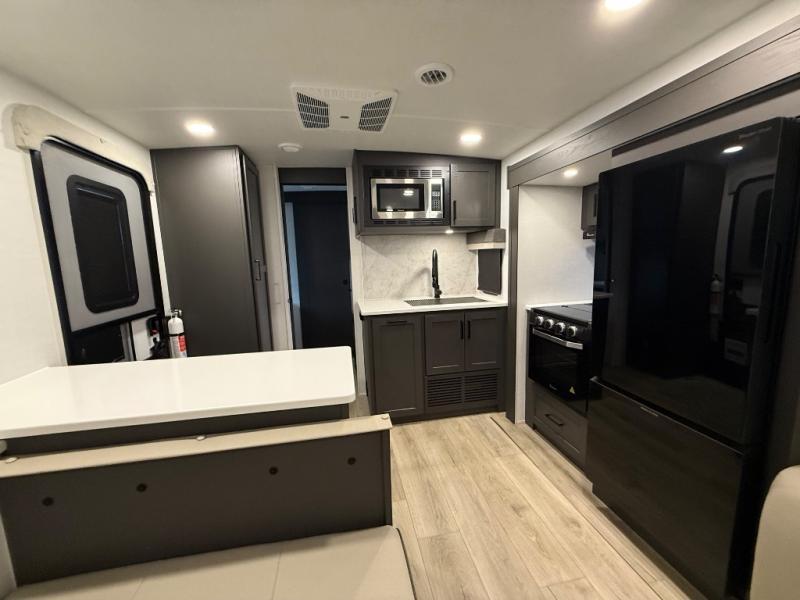 If you've been searching for a full-featured travel trailer, this is the one! Not only will you enjoy your own space up front in the master bedroom, but your guests can claim the rear bunkhouse suite all to themselves. There are two bunks with storage here, along with a desk, and a half bath for convenience. Your crew can meet in the middle living area on the theater seat or booth dinette. There is also a 39" TV here for movie nights! The chef can choose to cook indoors on the three burner range, or head outdoors to use the exterior griddle. A full walk-thru bath is sure to come in handy after a day at the lake, and did we mention this unit has dual entry doors?!