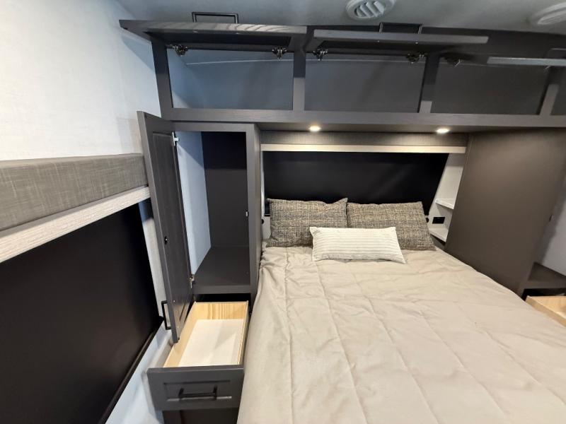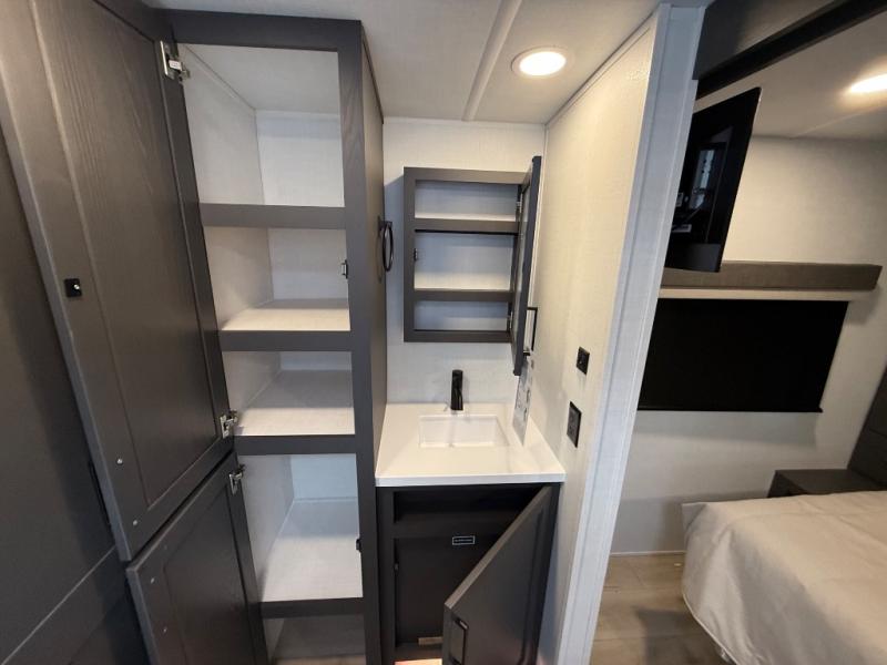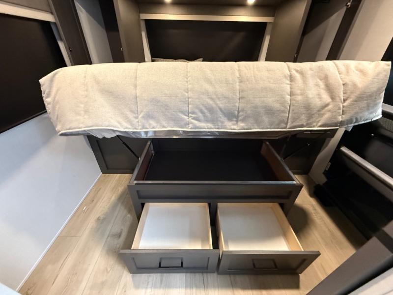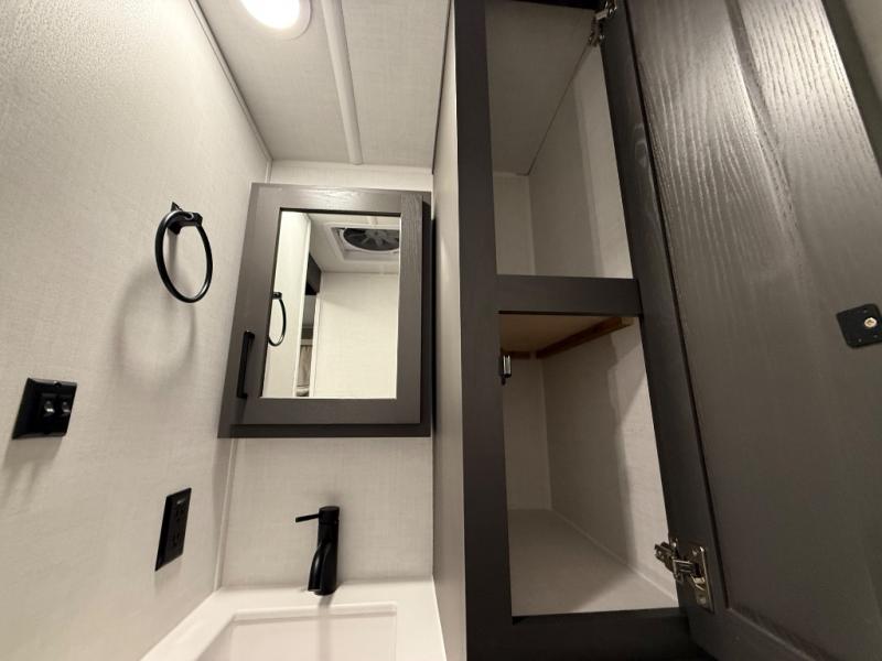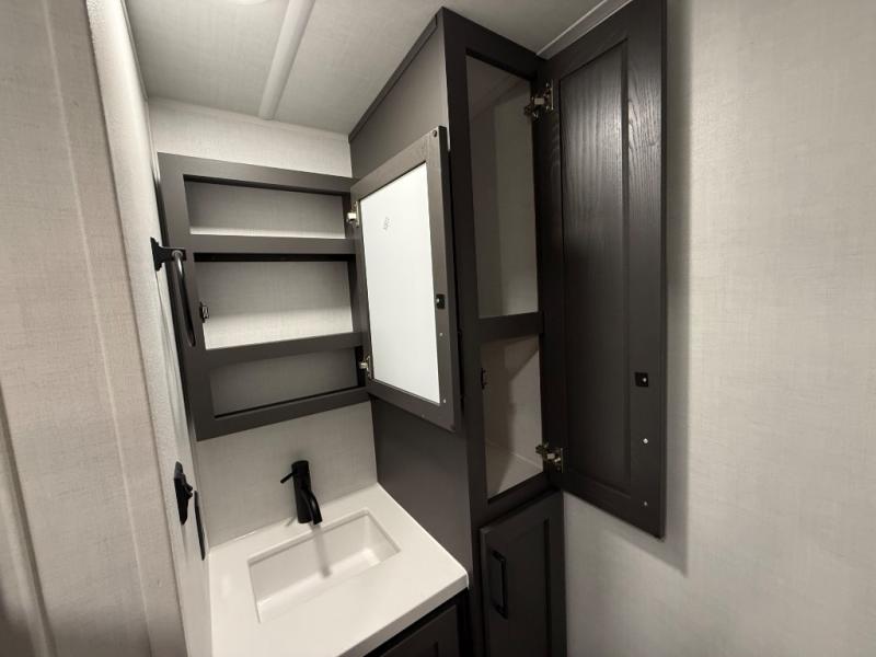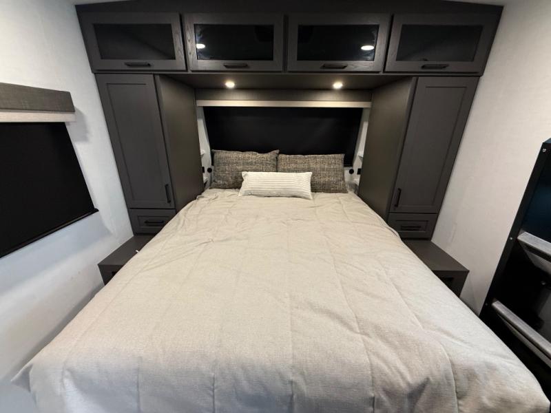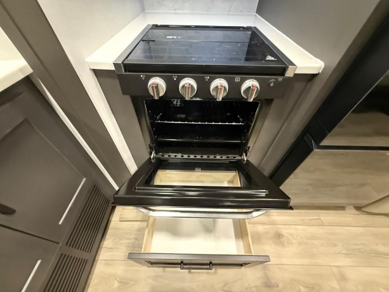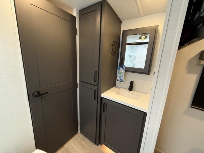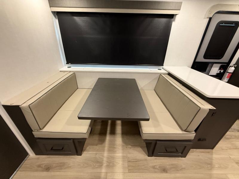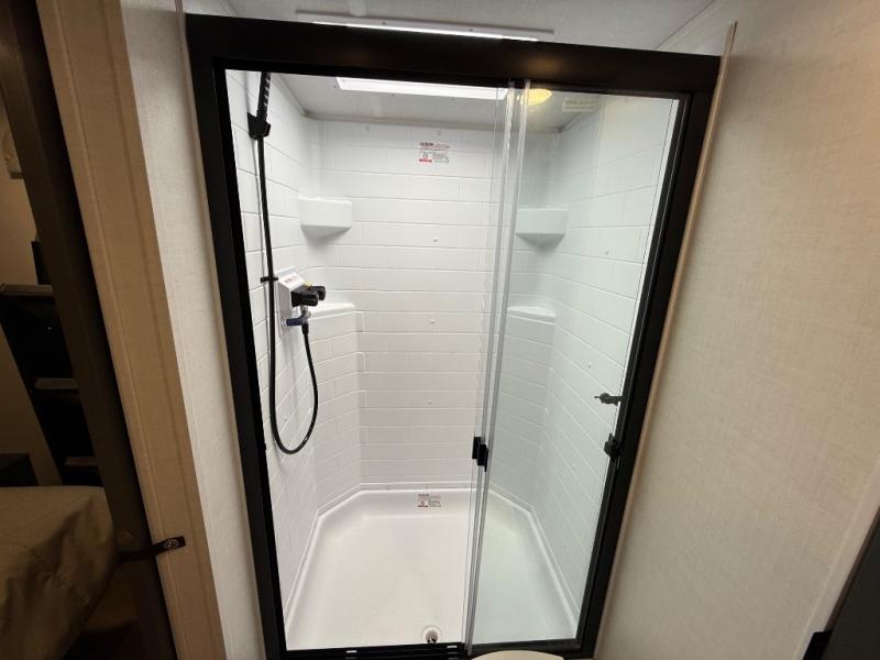If you've been searching for a full-featured travel trailer, this is the one! Not only will you enjoy your own space up front in the master bedroom, but your guests can claim the rear bunkhouse suite all to themselves. There are two bunks with storage here, along with a desk, and a half bath for convenience. Your crew can meet in the middle living area on the theater seat or booth dinette. There is also a 39" TV here for movie nights! The chef can choose to cook indoors on the three burner range, or head outdoors to use the exterior griddle. A full walk-thru bath is sure to come in handy after a day at the lake, and did we mention this unit has dual entry doors?!