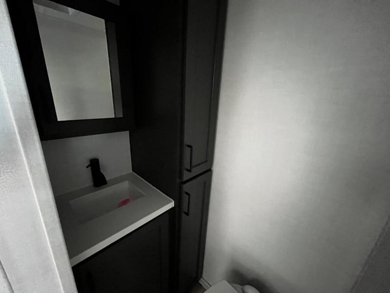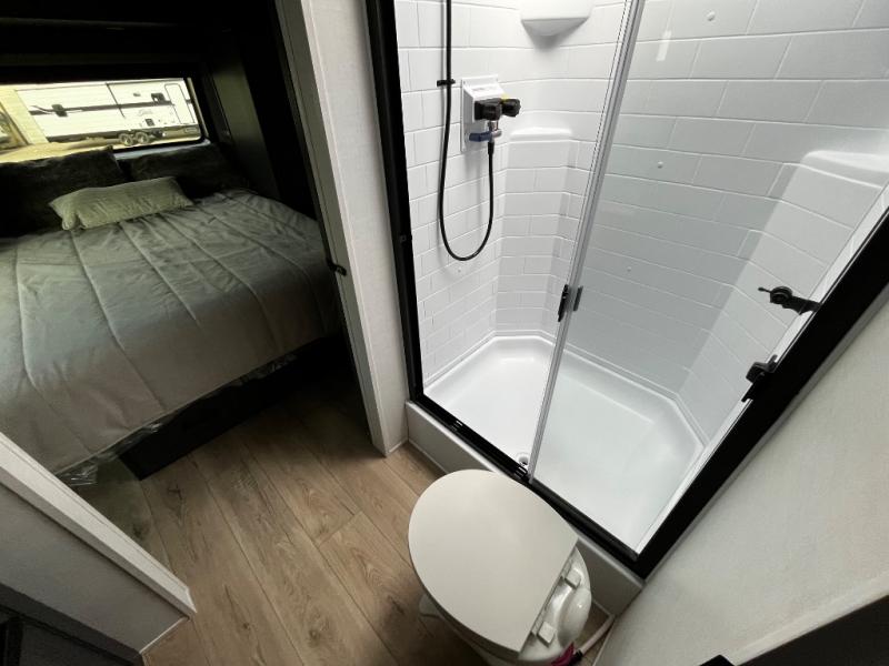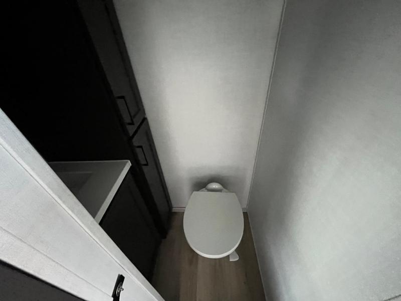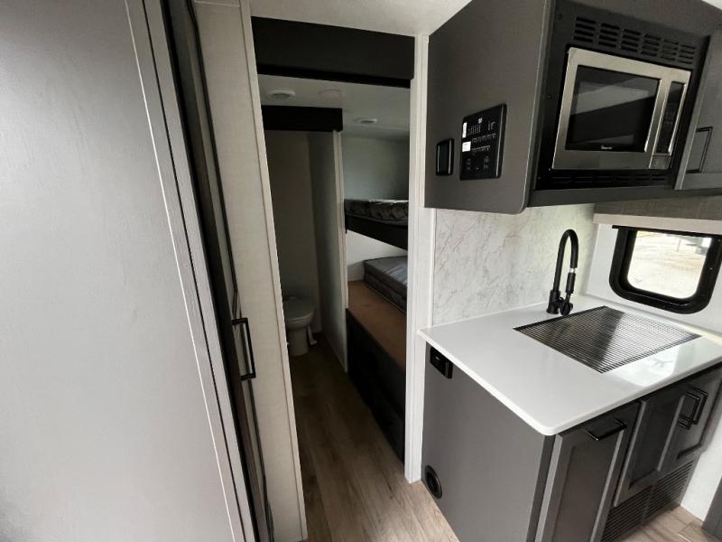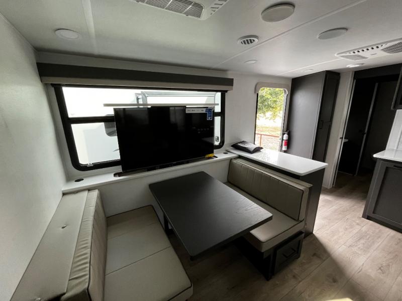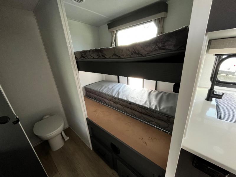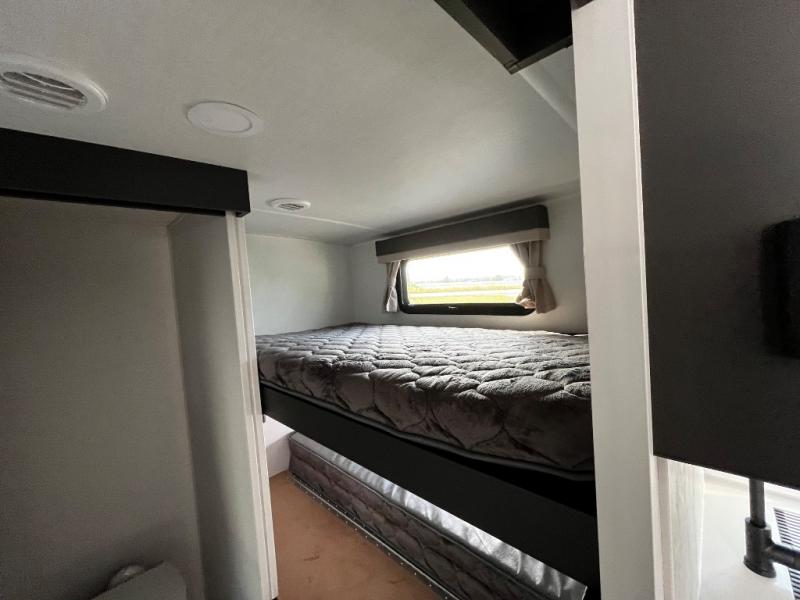 If you've been searching for a full-featured travel trailer, this is the one! Not only will you enjoy your own space up front in the master bedroom, but your guests can claim the rear bunkhouse suite all to themselves. There are two bunks with storage here, along with a desk, and a half bath for convenience. Your crew can meet in the middle living area on the theater seat or booth dinette. There is also a TV here for movie nights! Or gather around outside to enjoy the sunrise or sunset under the 24'6" power awning. A full walk-thru bath is sure to come in handy after a day at the lake, and did we mention this unit has dual entry doors?!