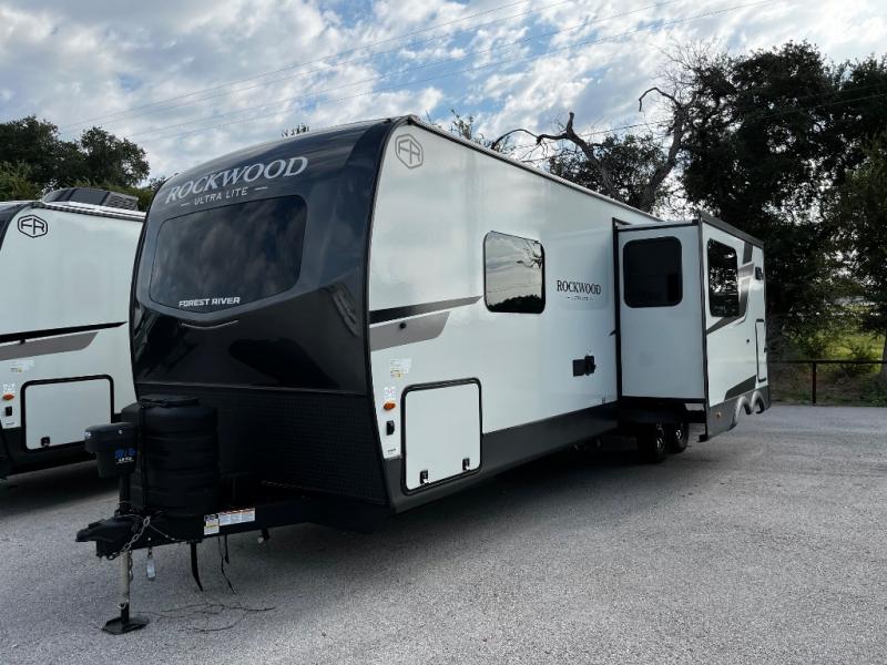 Each Rockwood Ultra Lite travel trailer by Forest River includes superior construction with a high gloss fiberglass cap, aluminum cage construction, and a power awning with LED lighting for a cozy and functional outdoor space. The torsion axle, power tongue jack will make towing smooth and hassle-free, along with the nitrogen filled, Goodyear Endurance tires and the tire pressure monitor system. Interior comforts include kitchen sink with high rise faucet, hidden hinge cabinet doors, and roller shades to name a few. Choose a Rockwood Ultra Lite travel trailer today!
