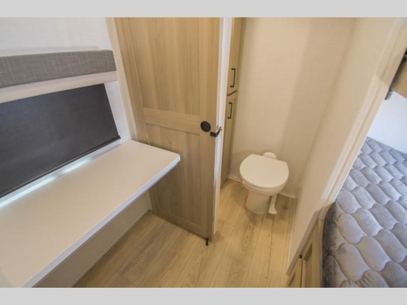 If you've been searching for a full-featured travel trailer, this is the one! Not only will you enjoy your own space up front in the master bedroom, but your guests can claim the rear bunkhouse suite all to themselves. There are two bunks with storage here, along with a desk, and a half bath for convenience. Your crew can meet in the middle living area on the theater seat or booth dinette. There is also a TV here for movie nights! Or gather around outside to enjoy the sunrise or sunset under the 24'6" power awning. A full walk-thru bath is sure to come in handy after a day at the lake, and did we mention this unit has dual entry doors?!