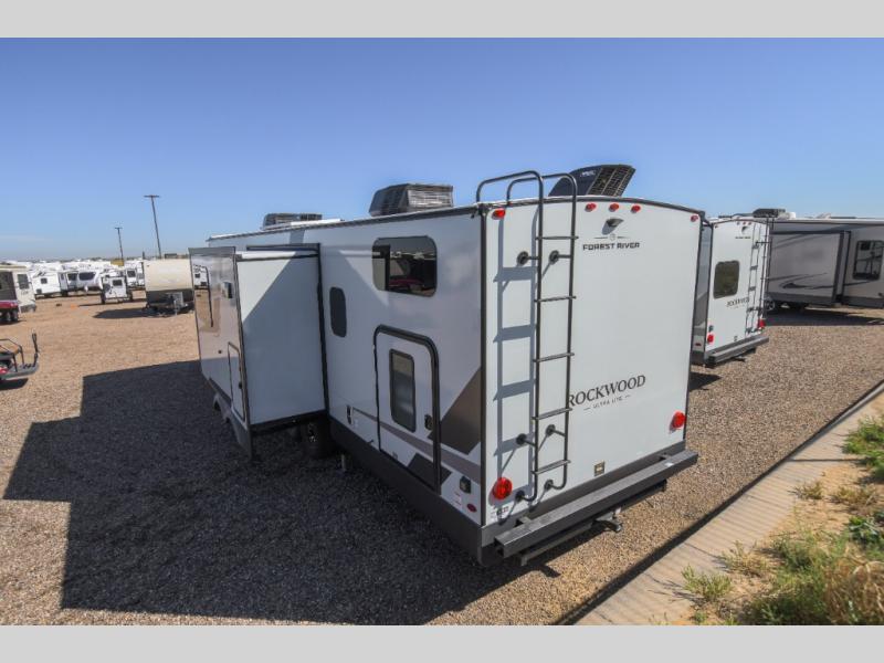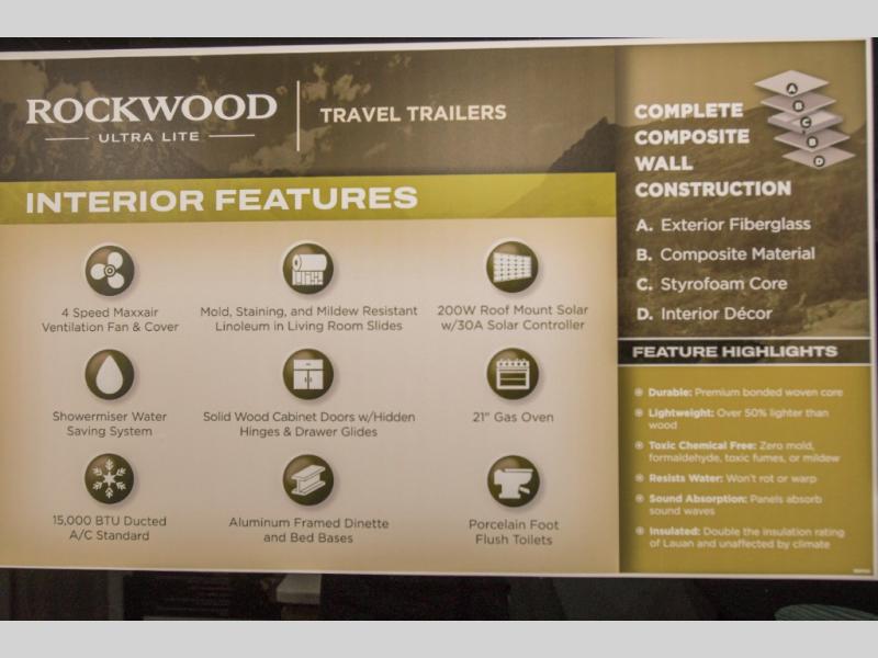 Each Rockwood Ultra Lite travel trailer by Forest River includes superior construction with a high gloss fiberglass cap, aluminum cage construction, and a power awning with LED lighting for a cozy and functional outdoor space. The torsion axle, power tongue jack will make towing smooth and hassle-free, along with the nitrogen filled, Goodyear Endurance tires and the tire pressure monitor system. Interior comforts include kitchen sink with high rise faucet, hidden hinge cabinet doors, and roller shades to name a few. Choose a Rockwood Ultra Lite travel trailer today!