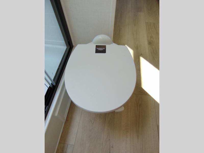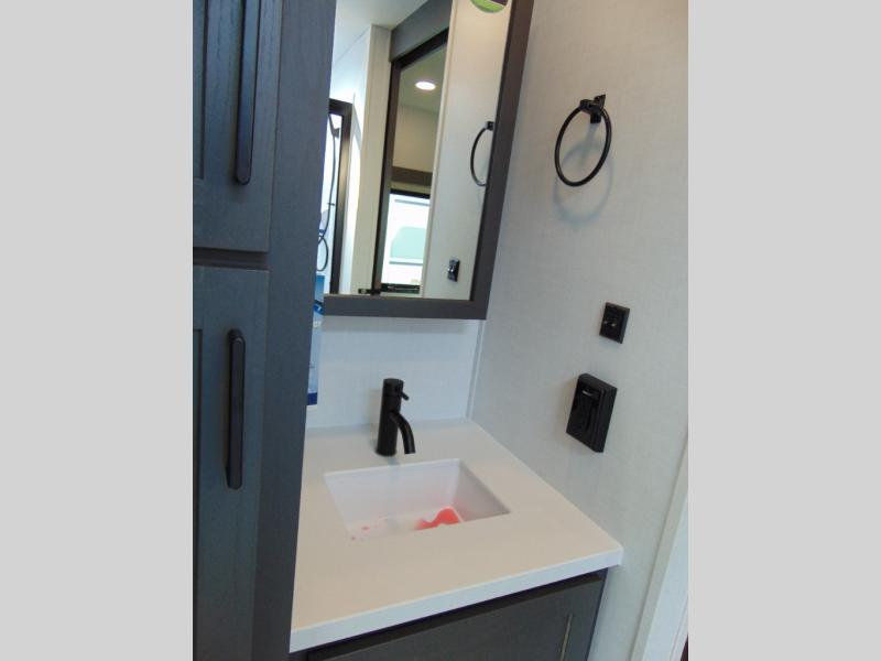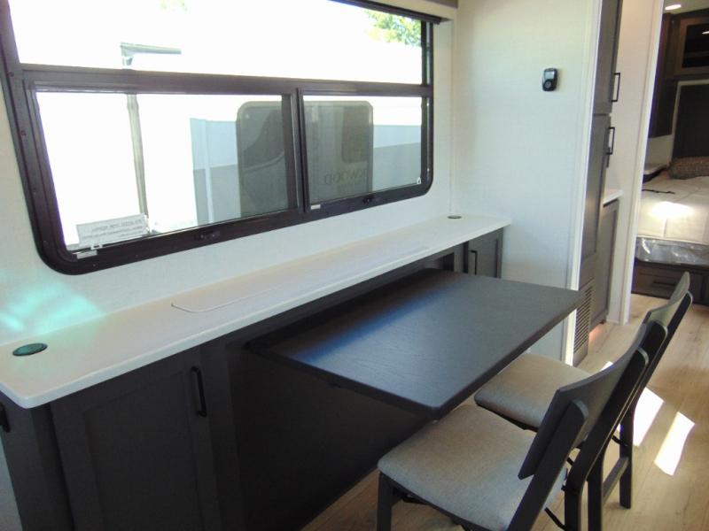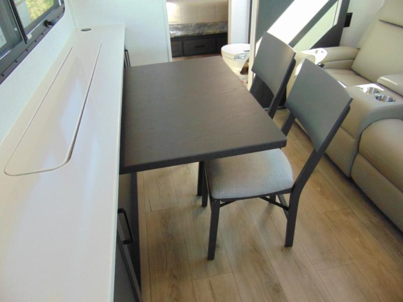This Rockwood Ultra Lite 301FKT is fit for a cook! As soon as you step inside, you're greeted by the spacious front kitchen. Designed for convenience and style, it has long solid surface countertops that provide ample space for meal prep and organizing utensils. The overhead cabinets offer plenty of room to store dishes and ingredients for all your favorite recipes. After cooking, you can unwind on the 67" theater seat facing a TV with a lift, perfect for movie nights or catching up on your favorite shows. For meals, enjoy dining at the flip-up table with folding chairs, ideal for sharing breakfast, lunch, or dinner with your partner. And when it's time to relax, a full bathroom leads to the rear bedroom, where a king-sized bed awaits to give you a restful night's sleep.