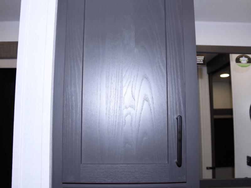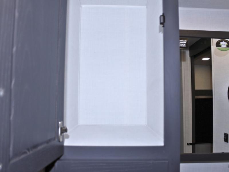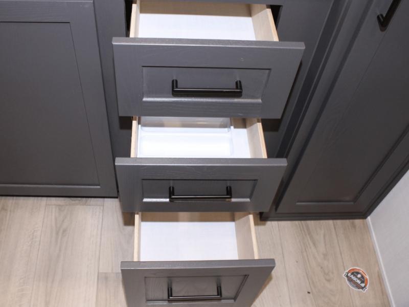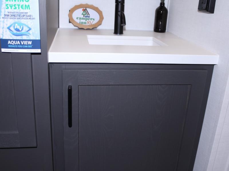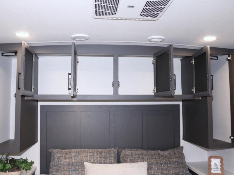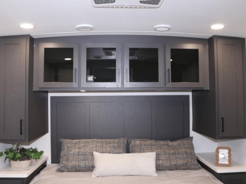 Step inside and you're instantly welcomed by the expansive front kitchen—a rare and coveted layout that gives you room to move, prep, and cook like a pro. Solid surface countertops stretch across the front, providing ample space to lay out ingredients, serve appetizers, or sip coffee while planning your next hike. Overhead cabinets offer deep storage for all your cookware and pantry essentials, so you’re always ready to whip up something delicious.