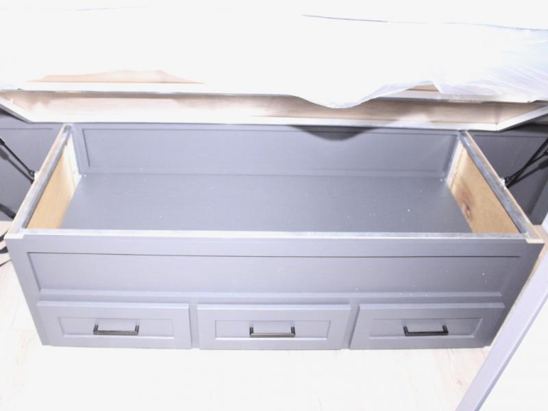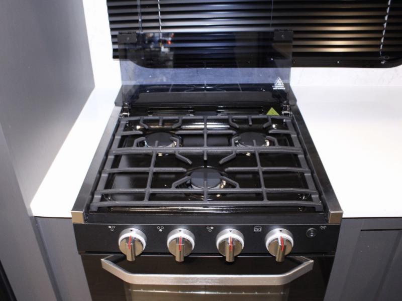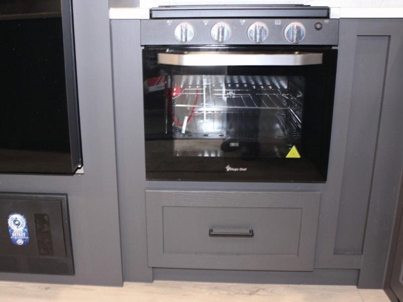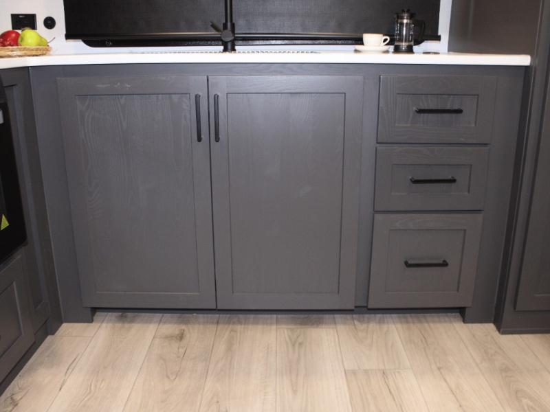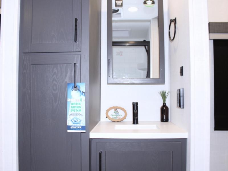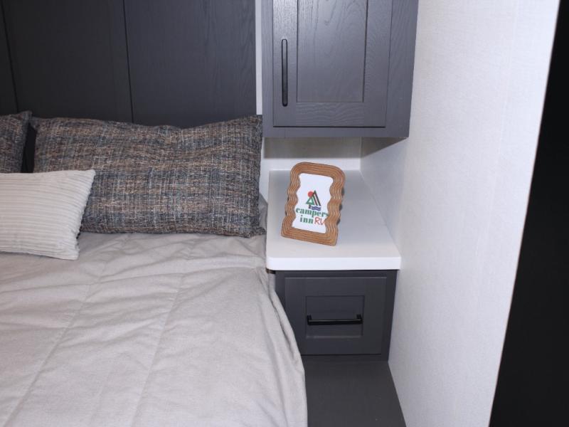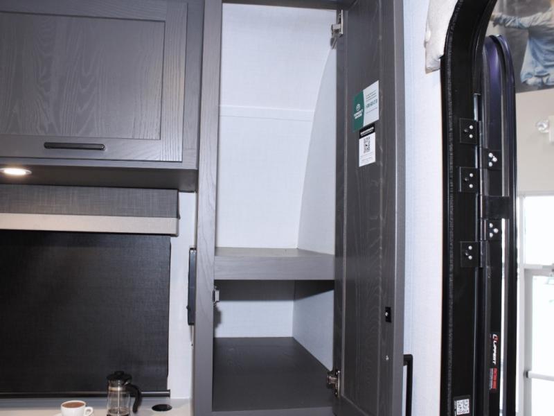 Step inside and you're instantly welcomed by the expansive front kitchen—a rare and coveted layout that gives you room to move, prep, and cook like a pro. Solid surface countertops stretch across the front, providing ample space to lay out ingredients, serve appetizers, or sip coffee while planning your next hike. Overhead cabinets offer deep storage for all your cookware and pantry essentials, so you’re always ready to whip up something delicious.