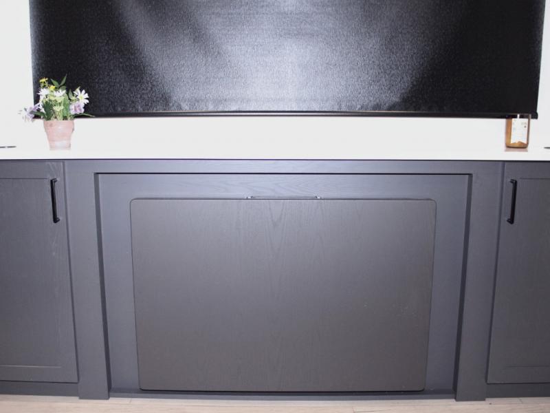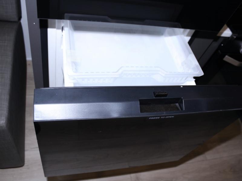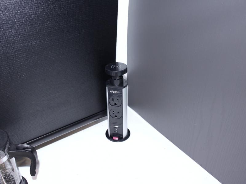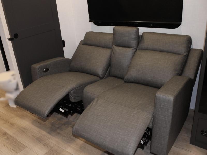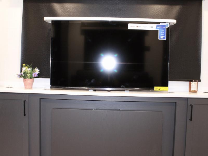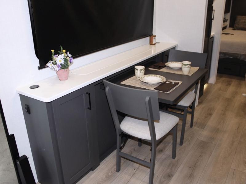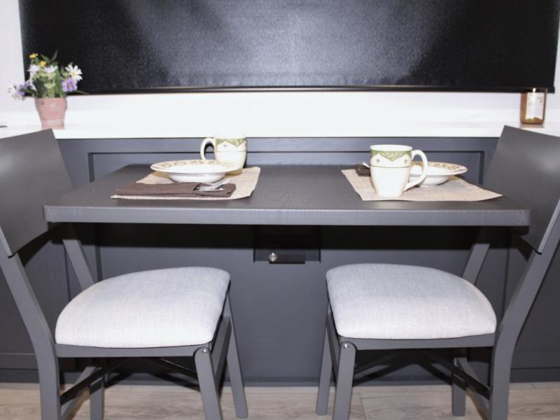 Tired from the road? Sink into the plush 67" theater seating and enjoy a movie on the TV with hidden lift, cleverly tucked away until showtime. Meals are easy and elegant with the flip-up dining table and included folding chairs—perfect for two but versatile for guests.