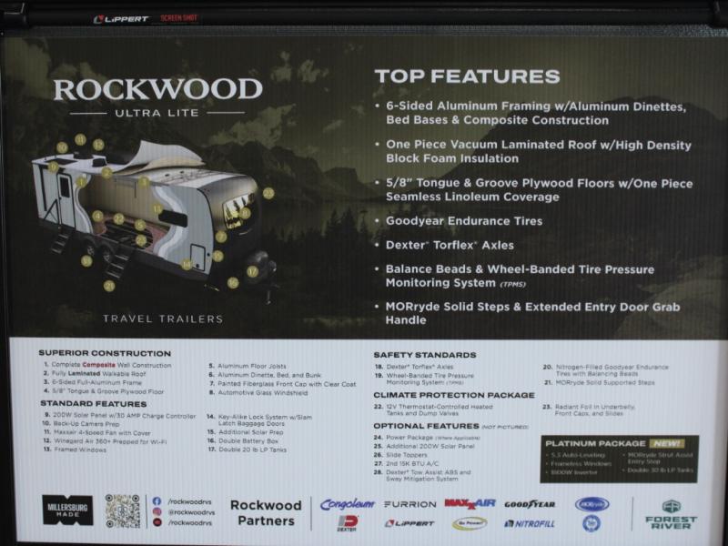 The Rockwood Ultra Lite series is built with Forest River’s commitment to quality—aluminum cage construction, a sleek high-gloss fiberglass cap, and an array of luxury features inside and out. With Goodyear Endurance tires, a torsion axle, and a tire pressure monitoring system, your ride is smooth and secure. Plus, a power tongue jack and LED-lit power awning make setup fast, safe, and enjoyable.